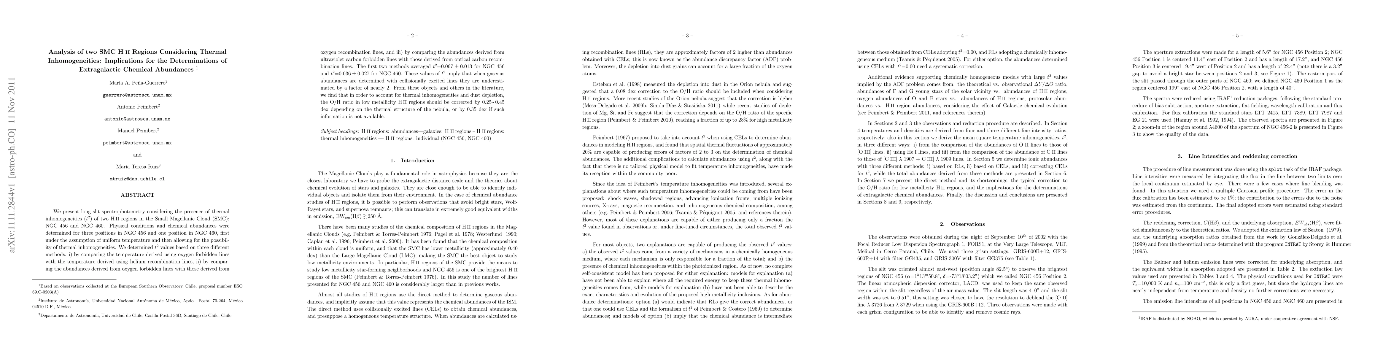 We present long slit spectrophotometry considering the presence of thermal inhomogeneities (t^2) of two HII regions in the Small Magellanic Cloud (SMC): NGC 456 and NGC 460. Physical conditions and chemical abundances were determined for three positions in NGC 456 and one position in NGC 460, first under the assumption of uniform temperature and then allowing for the possibility of thermal inhomogeneities. We determined t^2 values based on three different methods: i) by comparing the temperature derived using oxygen forbidden lines with the temperature derived using helium recombination lines, ii) by comparing the abundances derived from oxygen forbidden lines with those derived from oxygen recombination lines, and iii) by comparing the abundances derived from ultraviolet carbon forbidden lines with those derived from optical carbon recombination lines. The first two methods averaged t^2=0.067+-0.013 for NGC 456 and t^2=0.036+-0.027 for NGC 460. These values of t^2 imply that when gaseous abundances are determined with collisionally excited lines they are underestimated by a factor of nearly 2. From these objects and others in the literature, we find that in order to account for thermal inhomogeneities and dust depletion, the O/H ratio in low metallicity HII regions should be corrected by 0.25-0.45 dex depending on the thermal structure of the nebula, or by 0.35 dex if such information is not available.