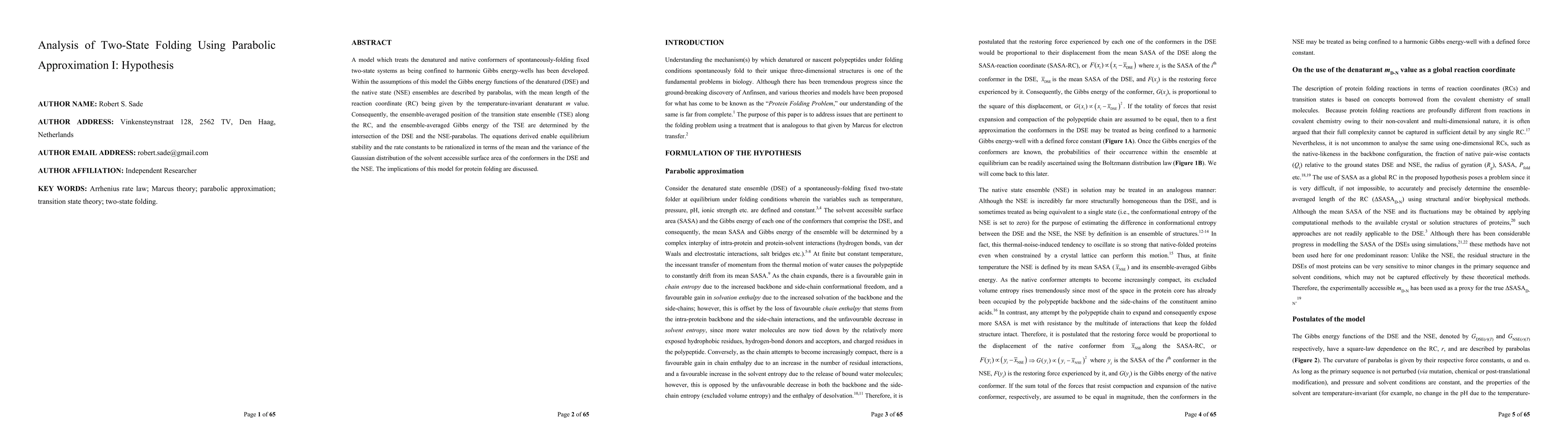 This paper develops a model for two-state protein folding where denatured and native states are confined to harmonic Gibbs energy-wells described by parabolas. The intersection of these parabolas determines the transition state ensemble, enabling rationalization of equilibrium stability and rate constants in terms of the Gaussian distribution of solvent accessible surface areas.