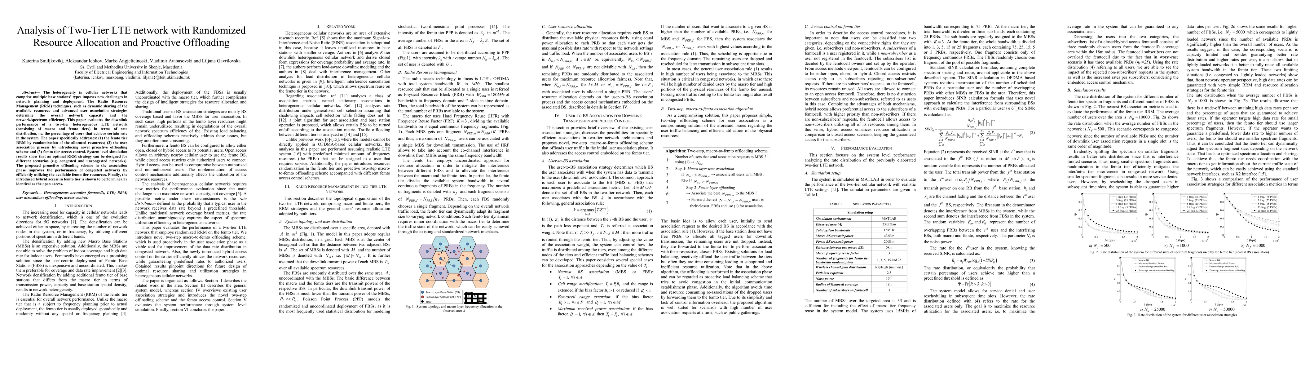 The heterogeneity in cellular networks that comprise multiple base stations types imposes new challenges in network planning and deployment. The Radio Resource Management (RRM) techniques, such as dynamic sharing of the available resources and advanced user association strategies determine the overall network capacity and the network/spectrum efficiency. This paper evaluates the downlink performance of a two-tier heterogeneous LTE network (consisting of macro and femto tiers) in terms of rate distribution, i.e. the percentage of users that achieve certain rate in the system. The paper specifically addresses: (1) the femto tier RRM by randomization of the allocated resources; (2) the user association process by introducing novel proactive offloading scheme and (3) femto tier access control. System level simulation results show that an optimal RRM strategy can be designed for different scenarios (e.g. congested and uncongested networks). The proposed proactive offloading scheme in the association phase improves the performance of congested networks by efficiently utilizing the available femto tier resources. Finally, the introduced hybrid access in femto tier is shown to perform nearly identical as the open access.