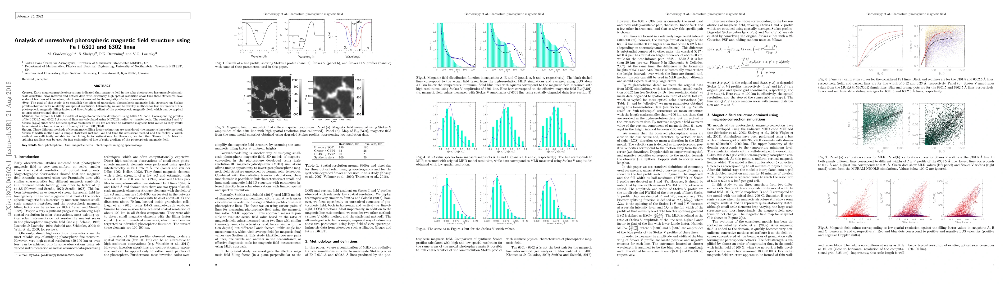Early magnetographic observations indicated that magnetic field in the solar photosphere has unresolved small-scale structure. Near-infrared and optical data with extremely high spatial resolution show that these structures have scales of few tens of kilometres, which are not resolved in the majority of solar observations. The goal of this study is to establish the effect of unresolved photospheric magnetic field structure on Stokes profiles observed with relatively low spatial resolution. Ultimately, we aim to develop methods for fast estimation of the photospheric magnetic filling factor and line-of-sight gradient of the photospheric magnetic field, which can be applied to large observational data sets. We exploit 3D MHD models of magneto-convection developed using MURAM code. Corresponding profiles of Fe I 6301.5 and 6302.5 $\mathrm{\AA}$ spectral lines are calculated using NICOLE radiative transfer code. The resulting I and V Stokes [x,y,$\lambda$] cubes with reduced spatial resolution of 150 km are used to calculate magnetic field values as they would be obtained in observations with Hinode/SOT or SDO/HMI. Three different methods of the magnetic filling factor estimation are considered: the magnetic line ratio method, Stokes V width method and a simple statistical method. We find that the statistical method and the Stokes V width method are sufficiently reliable for fast filling factor estimations. Furthermore, we find that Stokes $I\pm V$ bisector splitting gradient can be used for fast estimation of line-of-sight gradient of the photospheric magnetic field.