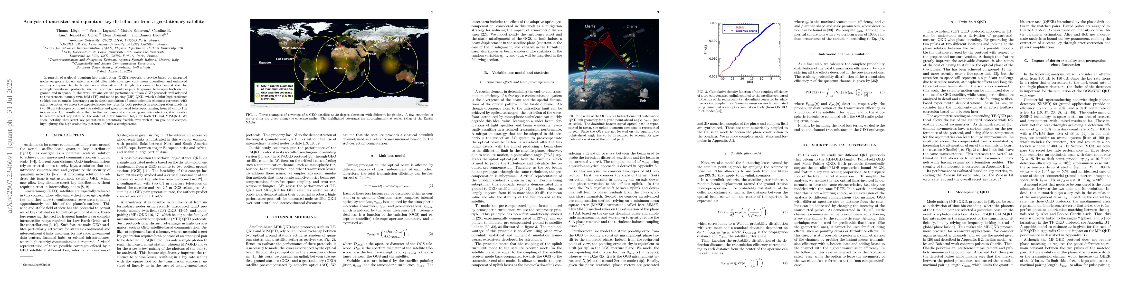 In pursuit of a global quantum key distribution (QKD) network, a service based on untrusted nodes on geostationary satellites could offer wide coverage, continuous operation, and enhanced security compared to the trusted node alternative. Although this scenario has been studied for entanglement-based protocols, such an approach would require large-area telescopes both on the ground and in space. In this work, we analyze the performance of two QKD protocols well adapted to this scenario, namely twin-field (TF) and mode-pairing (MP) QKD, which exhibit high resilience to high-loss channels. Leveraging an in-depth simulation of communication channels corrected with adaptive optics, we assess the expected secret key rates for both protocols in a configuration involving two 50 cm telescopes on board the satellite and ground-based telescopes ranging from 20 cm to 1 m in aperture. Our results show that, in the best case and considering realistic detectors, it is possible to achieve secret key rates on the order of a few hundred bit/s for both TF and MP-QKD. We show, notably, that secret key generation is potentially feasible even with 20 cm ground telescopes, highlighting the high scalability potential of such a configuration.