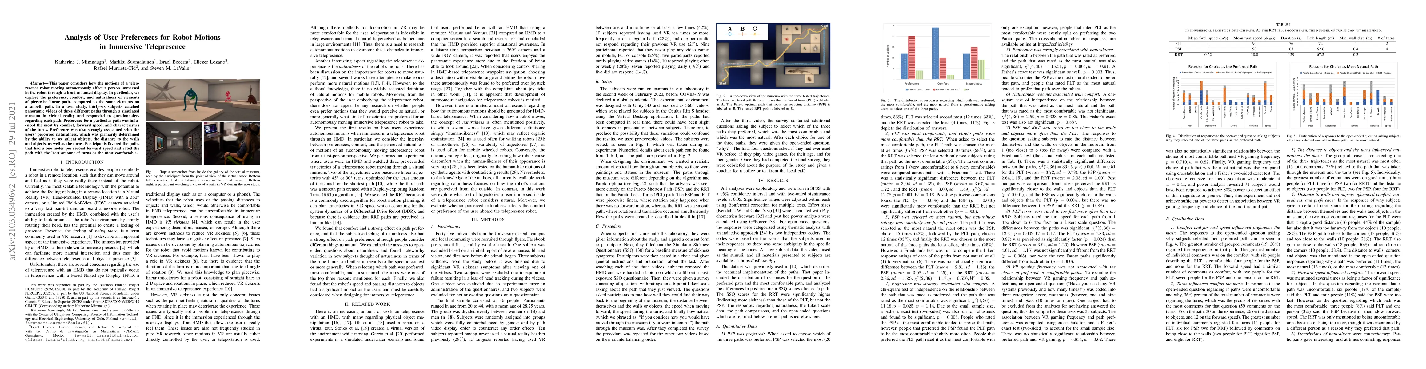 The paper presents a methodology for analyzing user preferences for robot motions in immersive telepresence, focusing on comfort, forward speed, and naturalness.