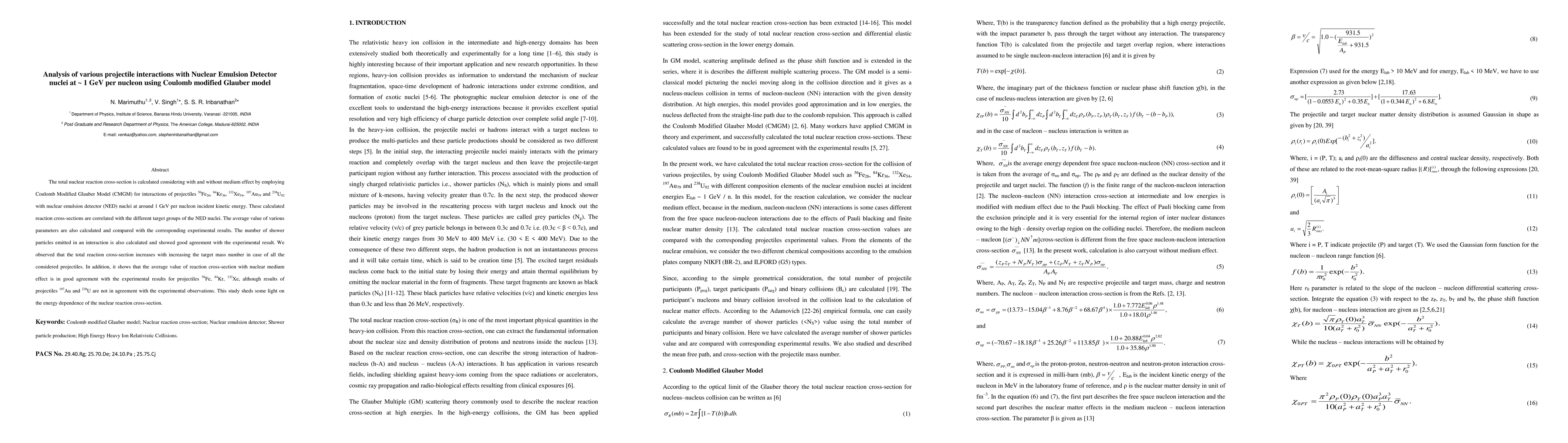 The total nuclear reaction cross-section is calculated considering with and without medium effect by employing Coulomb Modified Glauber Model (CMGM) for interactions of projectiles 56^Fe_26, 84^Kr_36, 132^Xe_54, 197^Au_79 and 238^U_92 with nuclear emulsion detector (NED) nuclei at around 1 GeV per nucleon incident kinetic energy. These calculated reaction cross-sections are correlated with the different target groups of the NED nuclei. The average value of various parameters are also calculated and compared with the corresponding experimental results. The number of shower particles emitted in an interaction is also calculated and showed good agreement with the experimental result. We observed that the total reaction cross-section increases with increasing the target mass number in case of all the considered projectiles. In addition, it shows that the average value of reaction cross-section with nuclear medium effect is in good agreement with the experimental results for projectiles 56^Fe, 84^Kr, 132^Xe, although results of projectiles 197^Au and 238^U are not in agreement with the experimental observations. This study sheds some light on the energy dependence of the nuclear reaction cross-section.