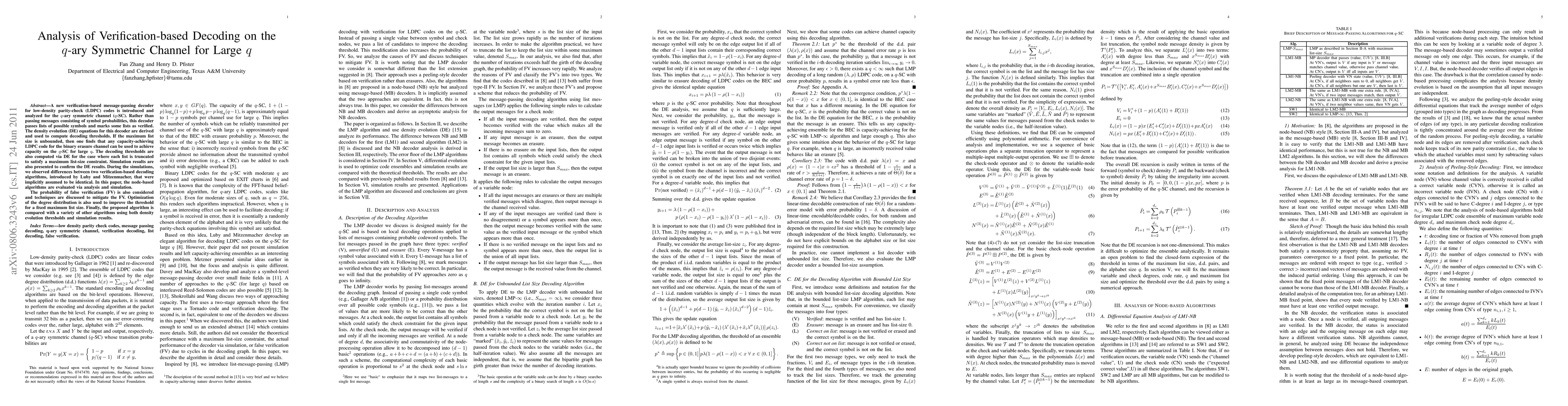 We discuss and analyze a list-message-passing decoder with verification for low-density parity-check (LDPC) codes on the q-ary symmetric channel (q-SC). Rather than passing messages consisting of symbol probabilities, this decoder passes lists of possible symbols and marks some lists as verified. The density evolution (DE) equations for this decoder are derived and used to compute decoding thresholds. If the maximum list size is unbounded, then we find that any capacity-achieving LDPC code for the binary erasure channel can be used to achieve capacity on the q-SC for large q. The decoding thresholds are also computed via DE for the case where each list is truncated to satisfy a maximum list size constraint. Simulation results are also presented to confirm the DE results. During the simulations, we observed differences between two verification-based decoding algorithms, introduced by Luby and Mitzenmacher, that were implicitly assumed to be identical. In this paper, we provide an analysis of the node-based algorithms from that paper and verify that it matches simulation results. The probability of false verification (FV) is also considered and techniques are discussed to mitigate the FV. Optimization of the degree distribution is also used to improve the threshold for a fixed maximum list size. Finally, the proposed algorithm is compared with a variety of other algorithms using both density evolution thresholds and simulation results.