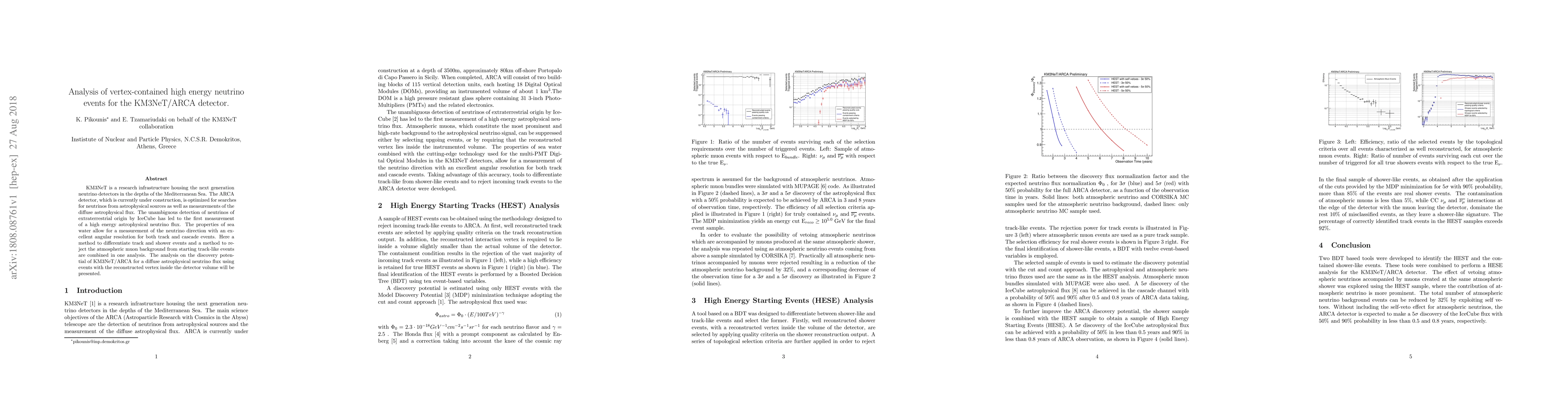 This paper presents an analysis method for detecting high energy neutrino events within the KM3NeT/ARCA detector, focusing on differentiating between track and shower events and rejecting atmospheric muons. It evaluates the detector's potential for measuring a diffuse astrophysical neutrino flux using events with a reconstructed vertex inside the detector.