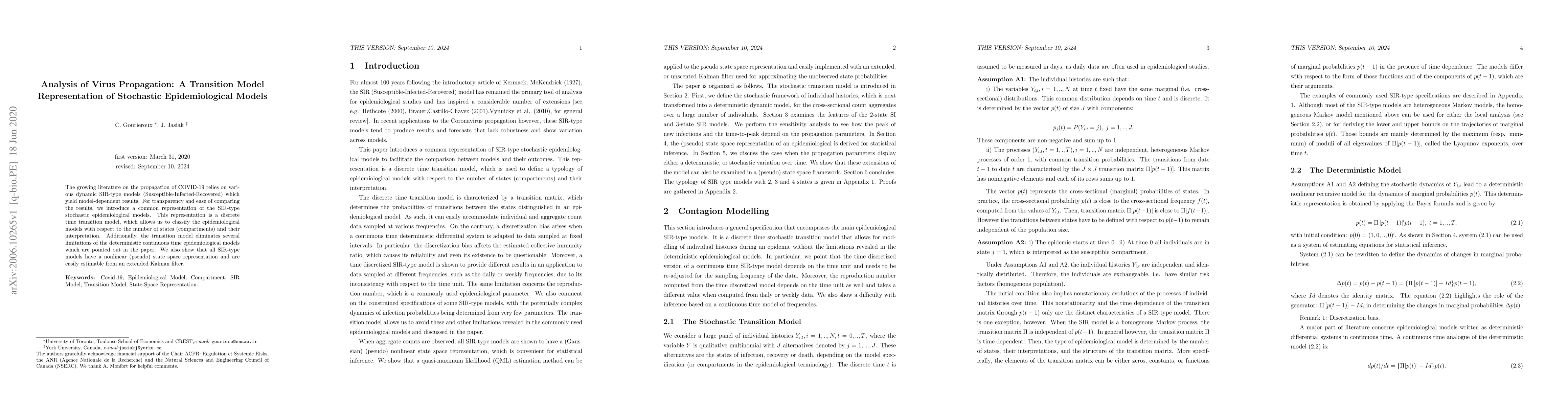 The growing literature on the propagation of COVID-19 relies on various dynamic SIR-type models (Susceptible-Infected-Recovered) which yield model-dependent results. For transparency and ease of comparing the results, we introduce a common representation of the SIR-type stochastic epidemiological models. This representation is a discrete time transition model, which allows us to classify the epidemiological models with respect to the number of states (compartments) and their interpretation. Additionally, the transition model eliminates several limitations of the deterministic continuous time epidemiological models which are pointed out in the paper. We also show that all SIR-type models have a nonlinear (pseudo) state space representation and are easily estimable from an extended Kalman filter.