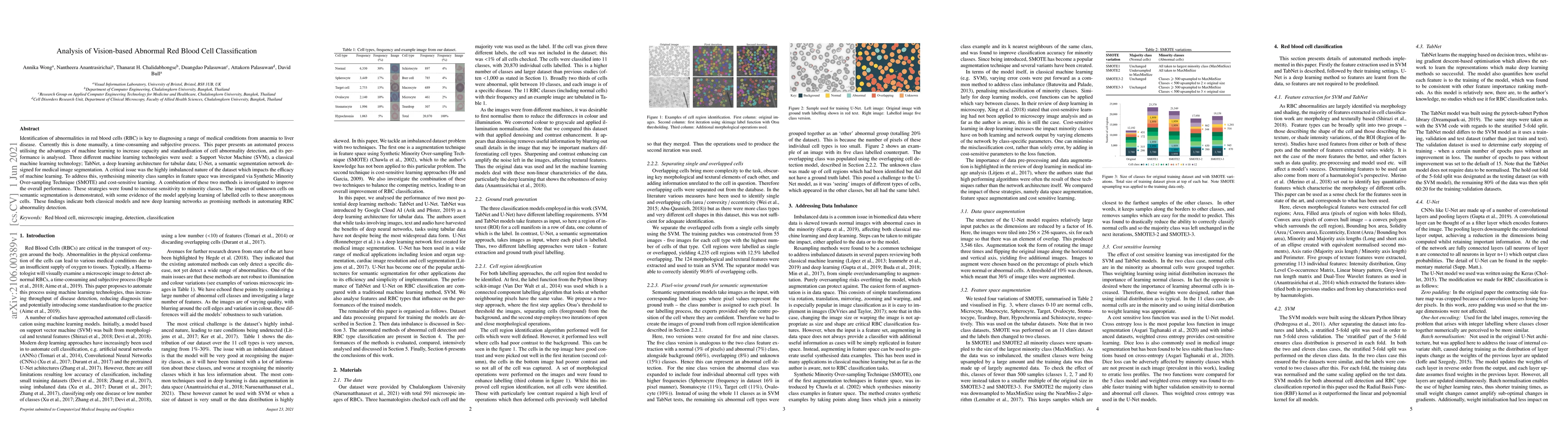 This paper develops an automated machine learning approach for classifying abnormal red blood cells using SVM, TabNet, and U-Net, addressing the imbalanced dataset issue with SMOTE and cost-sensitive learning. The results show improved sensitivity and potential for both classical and deep learning methods in automating RBC abnormality detection.