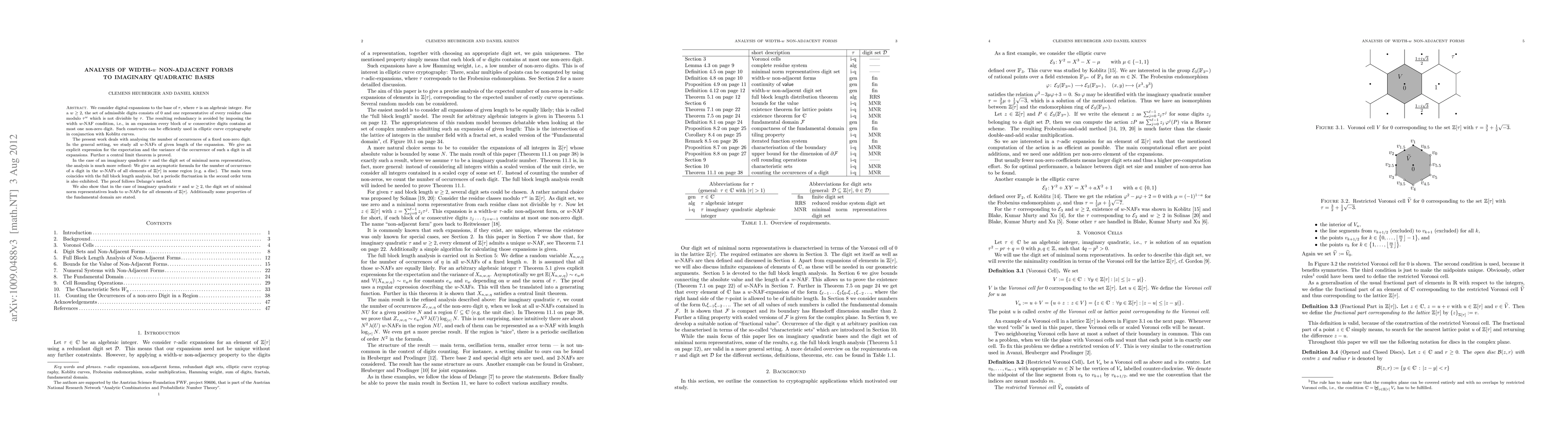 We consider digital expansions to the base of $\tau$, where $\tau$ is an algebraic integer. For a $w \geq 2$, the set of admissible digits consists of 0 and one representative of every residue class modulo $\tau^w$ which is not divisible by $\tau$. The resulting redundancy is avoided by imposing the width $w$-NAF condition, i.e., in an expansion every block of $w$ consecutive digits contains at most one non-zero digit. Such constructs can be efficiently used in elliptic curve cryptography in conjunction with Koblitz curves. The present work deals with analysing the number of occurrences of a fixed non-zero digit. In the general setting, we study all $w$-NAFs of given length of the expansion. We give an explicit expression for the expectation and the variance of the occurrence of such a digit in all expansions. Further a central limit theorem is proved. In the case of an imaginary quadratic $\tau$ and the digit set of minimal norm representatives, the analysis is much more refined: We give an asymptotic formula for the number of occurrence of a digit in the $w$-NAFs of all elements of $\Z[\tau]$ in some region (e.g. a disc). The main term coincides with the full block length analysis, but a periodic fluctuation in the second order term is also exhibited. The proof follows Delange's method. We also show that in the case of imaginary quadratic $\tau$ and $w \geq 2$, the digit set of minimal norm representatives leads to $w$-NAFs for \emph{all} elements of $\Z[\tau]$. Additionally some properties of the fundamental domain are stated.