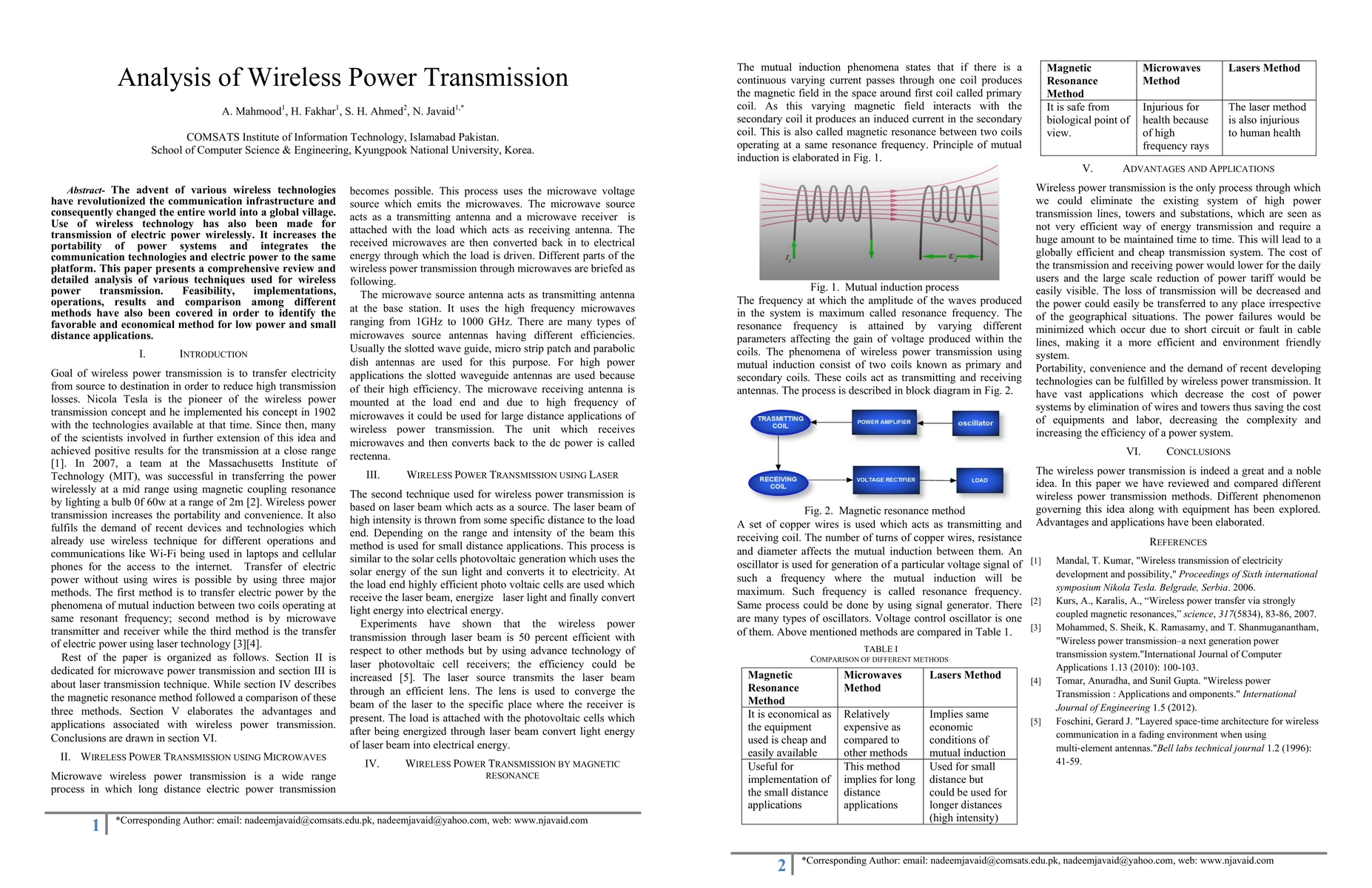 This paper analyzes various techniques for wireless power transmission, focusing on feasibility, implementation, and results for low-power and short-distance applications. It aims to identify the most favorable and economical method for integrating communication technologies and electric power wirelessly.