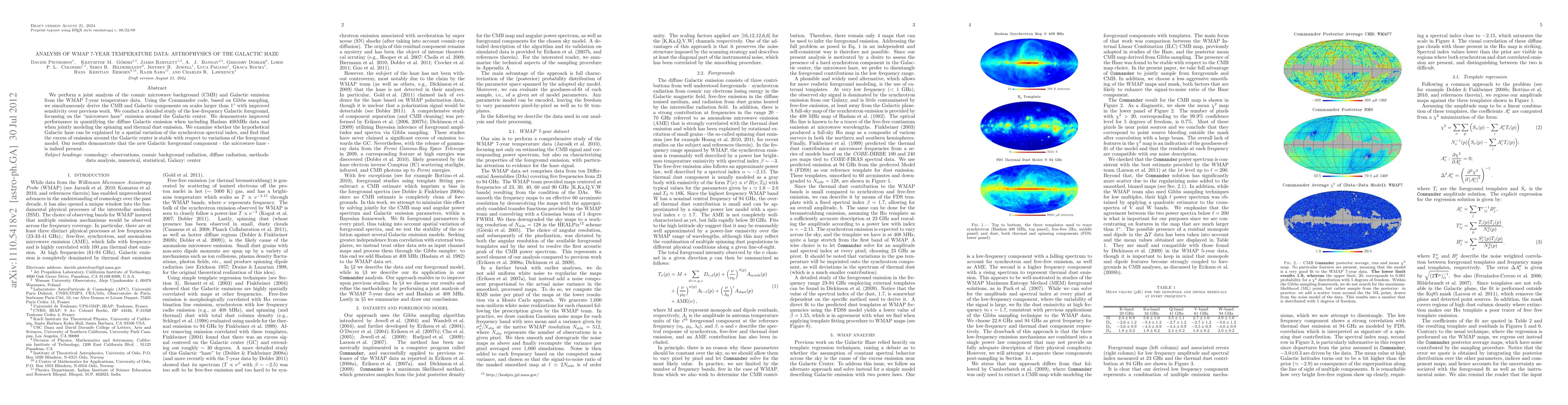 We analyse WMAP 7-year temperature data, jointly modeling the cosmic microwave background (CMB) and Galactic foreground emission. We use the Commander code based on Gibbs sampling. Thus, from the WMAP7 data, we derive simultaneously the CMB and Galactic components on scales larger than 1deg with sensitivity improved relative to previous work. We conduct a detailed study of the low-frequency foreground with particular focus on the "microwave haze" emission around the Galactic center. We demonstrate improved performance in quantifying the diffuse galactic emission when Haslam 408MHz data are included together with WMAP7, and the spinning and thermal dust emission is modeled jointly. We also address the question of whether the hypothetical galactic haze can be explained by a spatial variation of the synchrotron spectral index. The excess of emission around the Galactic center appears stable with respect to variations of the foreground model that we study. Our results demonstrate that the new galactic foreground component - the microwave haze - is indeed present.