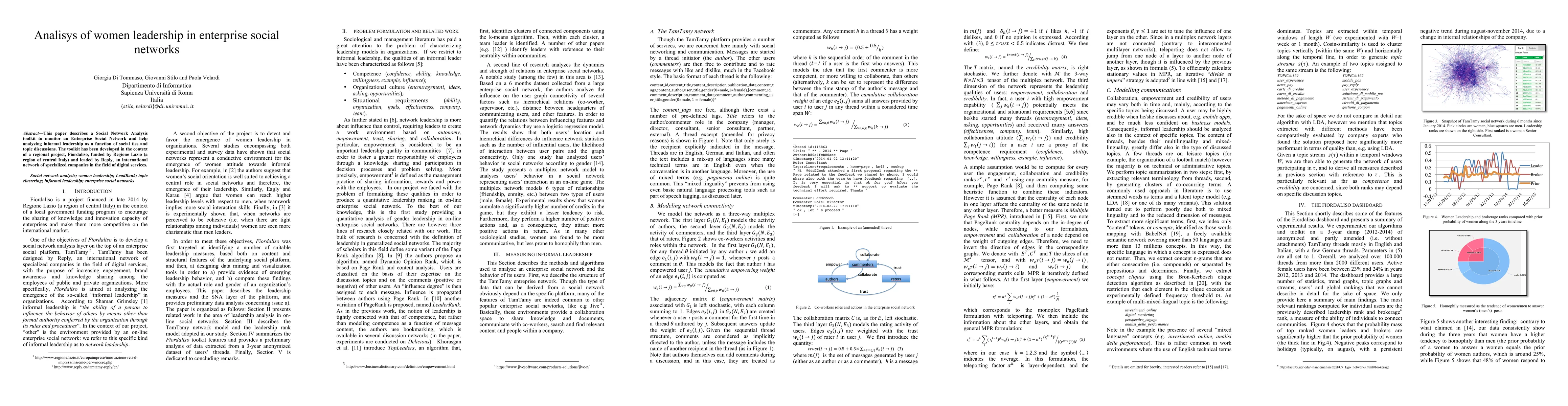 This paper presents a Social Network Analysis toolkit to monitor enterprise social networks and analyze informal women leadership based on social ties and topic discussions. Developed under the Fiordaliso project, it aims to enhance understanding of leadership dynamics in digital services.
