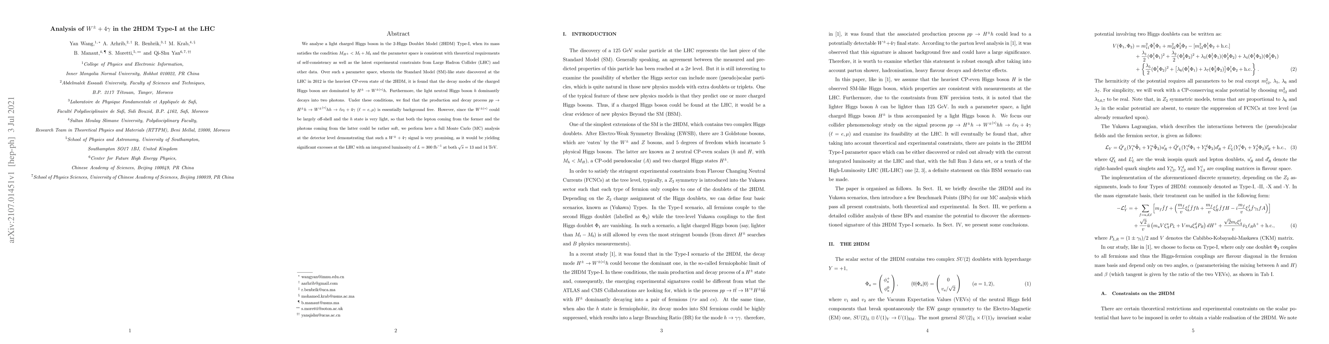 This paper analyzes a light charged Higgs boson in the 2HDM Type-I, focusing on its decay modes and production processes at the LHC. It finds that the $W^\pm + 4\gamma$ signal from $pp \to H^\pm h \to W^\pm h h$ is promising and essentially background-free, with significant excess expected at 300 fb$^{-1}$ integrated luminosity at 13 and 14 TeV.