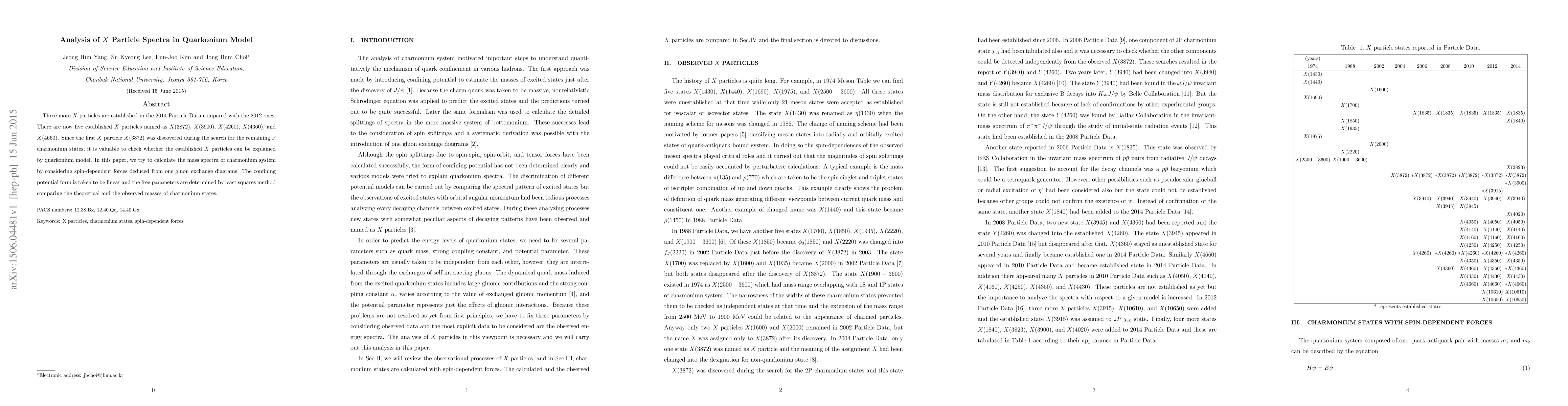 Three more $X$ particles are established in the 2014 Particle Data compared with the 2012 ones. There are now five established $X$ particles named as $X(3872)$, $X(3900)$, $X(4260)$, $X(4360)$, and $X(4660)$. Since the first $X$ particle $X(3872)$ was discovered during the search for the remaining P charmonium states, it is valuable to check whether the established $X$ particles can be explained by quarkonium model. In this paper, we try to calculate the mass spectra of charmonium system by considering spin-dependent forces deduced from one gluon exchange diagrams. The confining potential form is taken to be linear and the free parameters are determined by least squares method comparing the theoretical and the observed masses of charmonium states.
