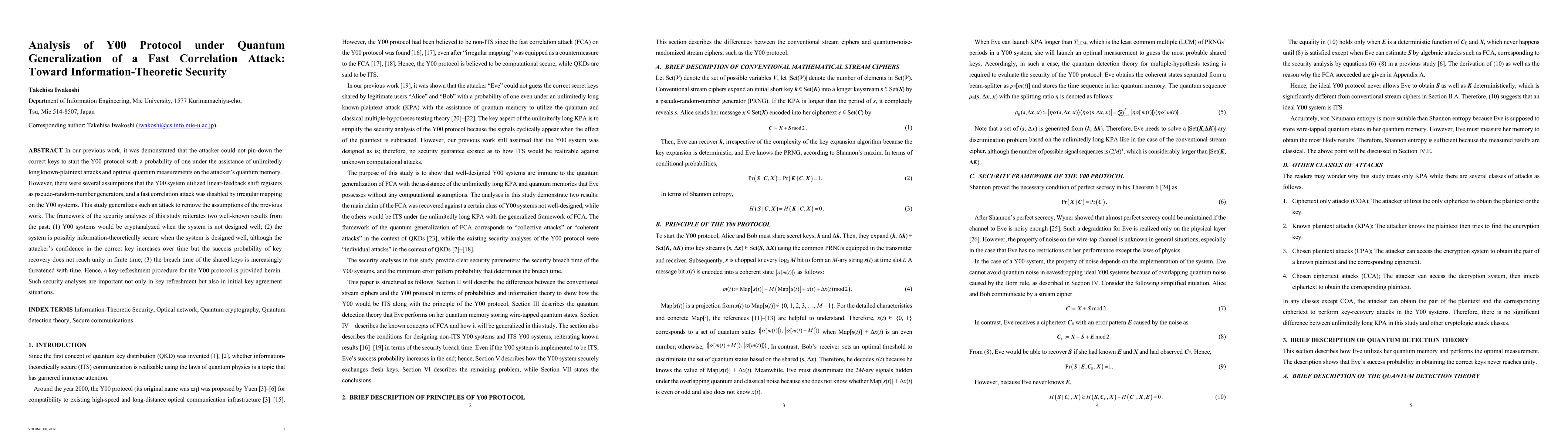 This study generalizes a fast correlation attack on the Y00 protocol to remove assumptions from previous work, highlighting the importance of key refreshment procedures for information-theoretic security.