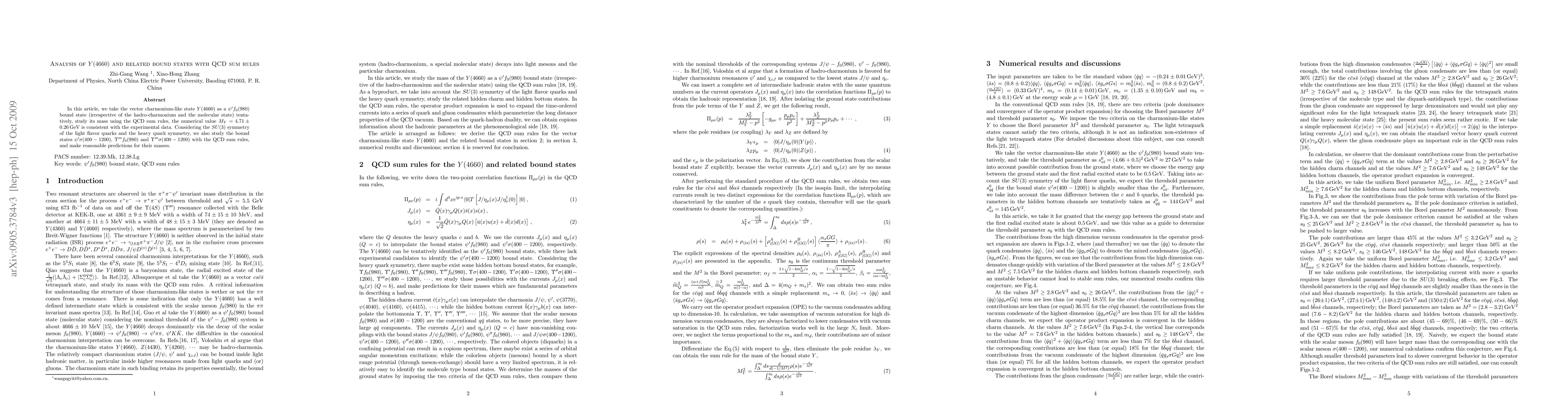 This paper analyzes the Y(4660) charmonium-like state as a potential $\psi'f_0(980)$ bound state using QCD sum rules, finding a mass of $M_Y=4.71\pm0.26 \rm{GeV}$. It also explores related bound states $\psi'\sigma$, $\Upsilon'"f_0(980)$, and $\Upsilon"'\sigma$ under SU(3) and heavy quark symmetry, providing predictions for their masses.