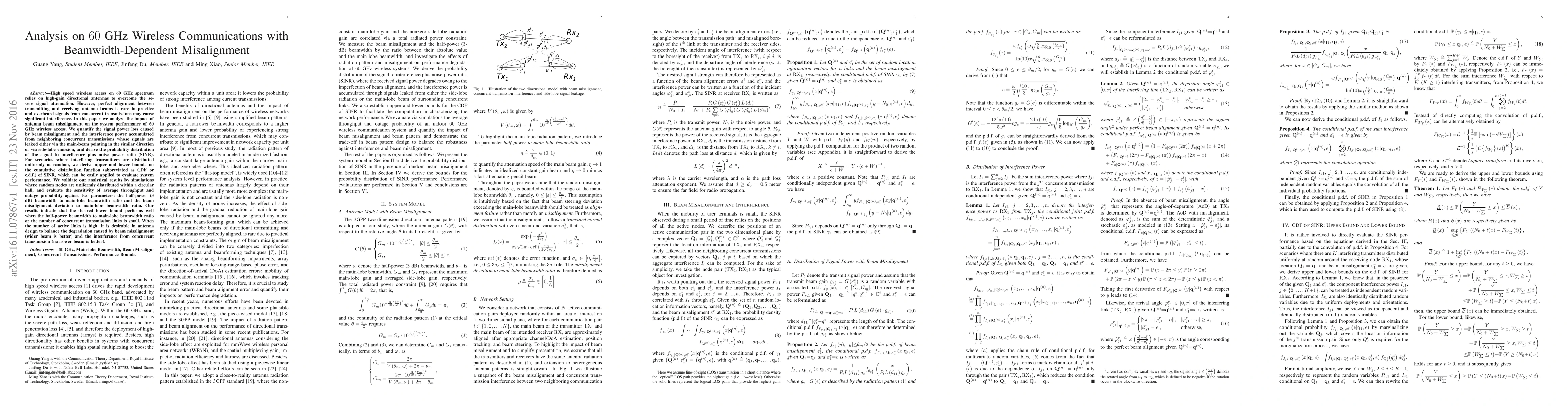 This paper analyzes the impact of antenna beam misalignment on 60 GHz wireless communications, quantifying signal power loss and interference from concurrent transmissions. It derives bounds on the signal to interference plus noise ratio (SINR) and validates the results through simulations, showing that wider beams help mitigate misalignment but increase interference.