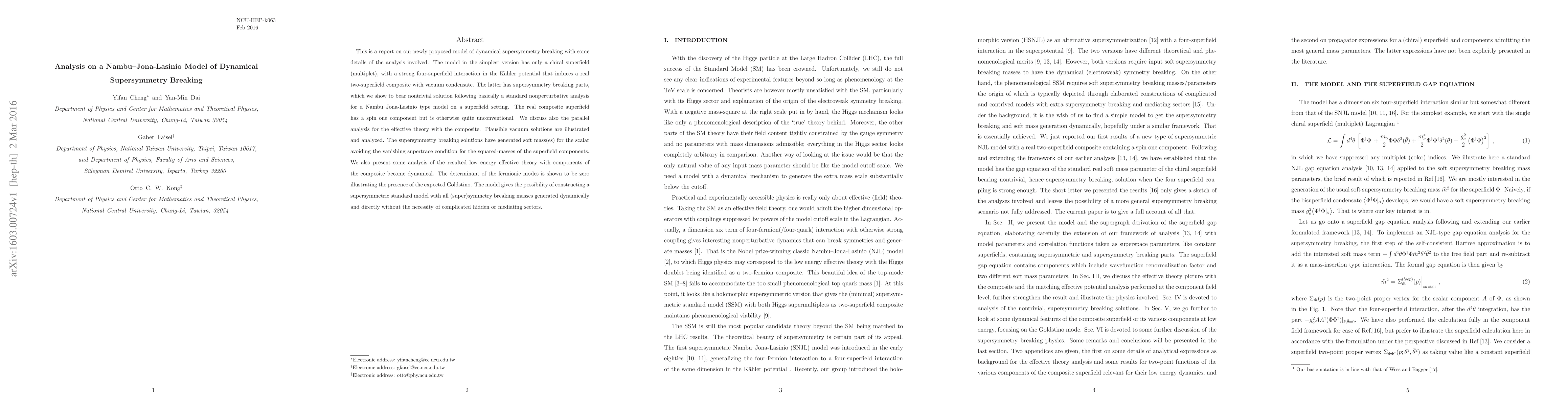 This is a report on our newly proposed model of dynamical supersymmetry breaking with some details of the analysis involved. The model in the simplest version has only a chiral superfield (multiplet), with a strong four-superfield interaction in the K\"ahler potential that induces a real two-superfield composite with vacuum condensate. The latter has supersymmetry breaking parts, which we show to bear nontrivial solution following basically a standard nonperturbative analysis for a Nambu--Jona-Lasinio type model on a superfield setting. The real composite superfield has a spin one component but is otherwise quite unconventional. We discuss also the parallel analysis for the effective theory with the composite. Plausible vacuum solutions are illustrated and analyzed. The supersymmetry breaking solutions have generated soft mass(es) for the scalar avoiding the vanishing supertrace condition for the squared-masses of the superfield components. We also present some analysis of the resulted low energy effective theory with components of the composite become dynamical. The determinant of the fermionic modes is shown to be zero illustrating the presence of the expected Goldstino. The model gives the possibility of constructing a supersymmetric standard model with all (super)symmetry breaking masses generated dynamically and directly without the necessity of complicated hidden or mediating sectors.