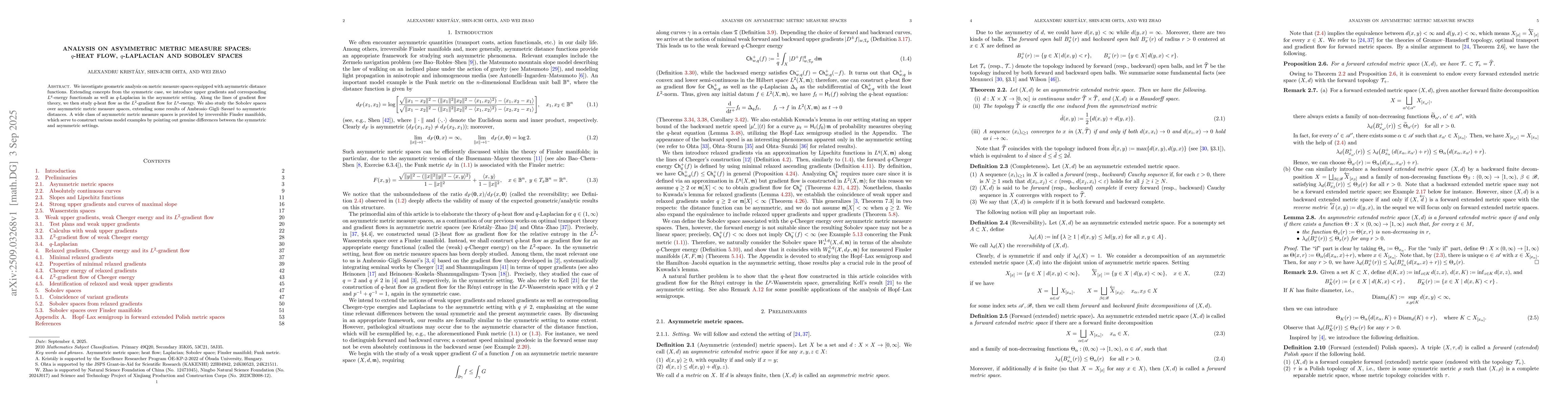 We investigate geometric analysis on metric measure spaces equipped with asymmetric distance functions. Extending concepts from the symmetric case, we introduce upper gradients and corresponding $L^q$-energy functionals as well as $q$-Laplacian in the asymmetric setting. Along the lines of gradient flow theory, we then study $q$-heat flow as the $L^2$-gradient flow for $L^q$-energy. We also study the Sobolev spaces over asymmetric metric measure spaces, extending some results of Ambrosio--Gigli--Savar\'e to asymmetric distances. A wide class of asymmetric metric measure spaces is provided by irreversible Finsler manifolds, which serve to construct various model examples by pointing out genuine differences between the symmetric and asymmetric settings.