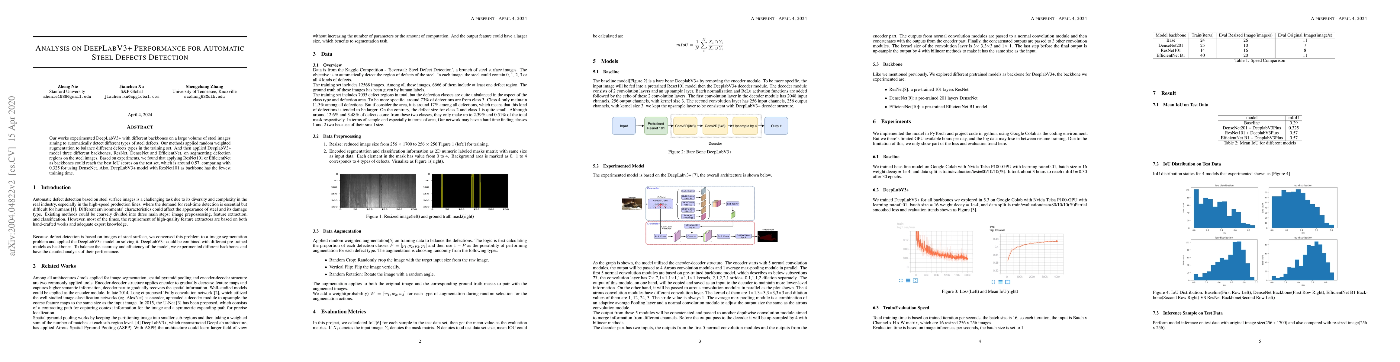 This study evaluates DeepLabV3+ with various backbones—ResNet, DenseNet, and EfficientNet—for automatic steel defect detection. The best performance, with an IoU score of approximately 0.57, was achieved using ResNet101 or EfficientNet, while DenseNet yielded a lower score of 0.325.