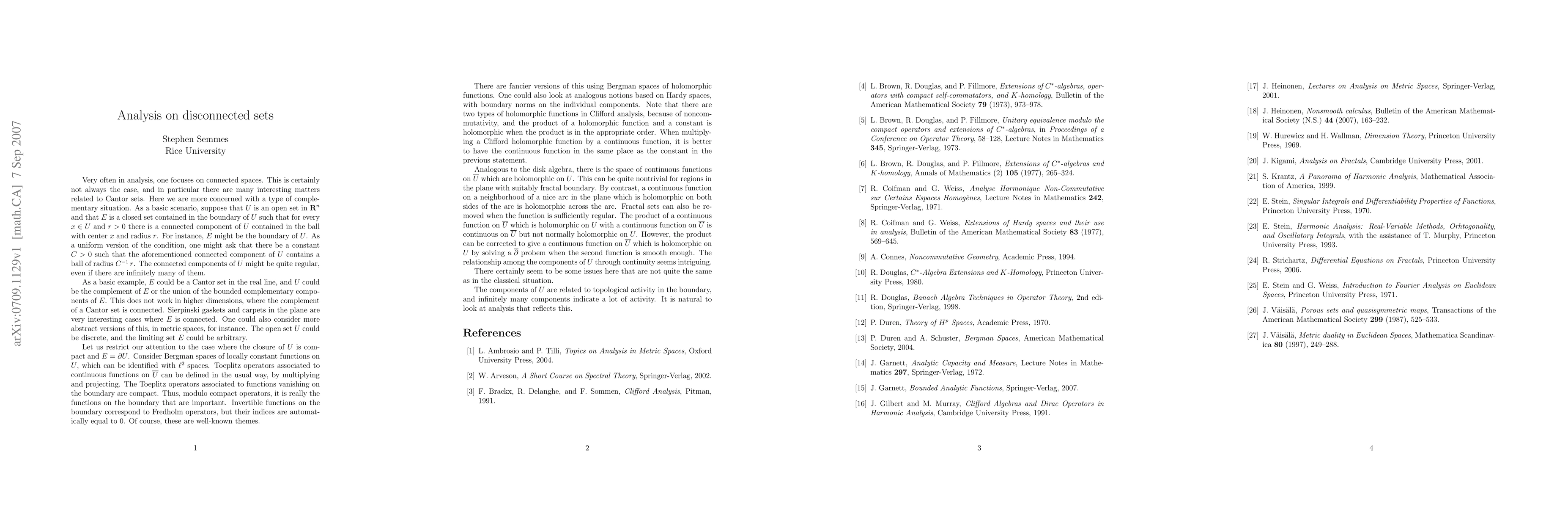 Some aspects of analysis on disconnected sets are briefly discussed, more along the lines of regions with infinitely many components than Cantor sets.