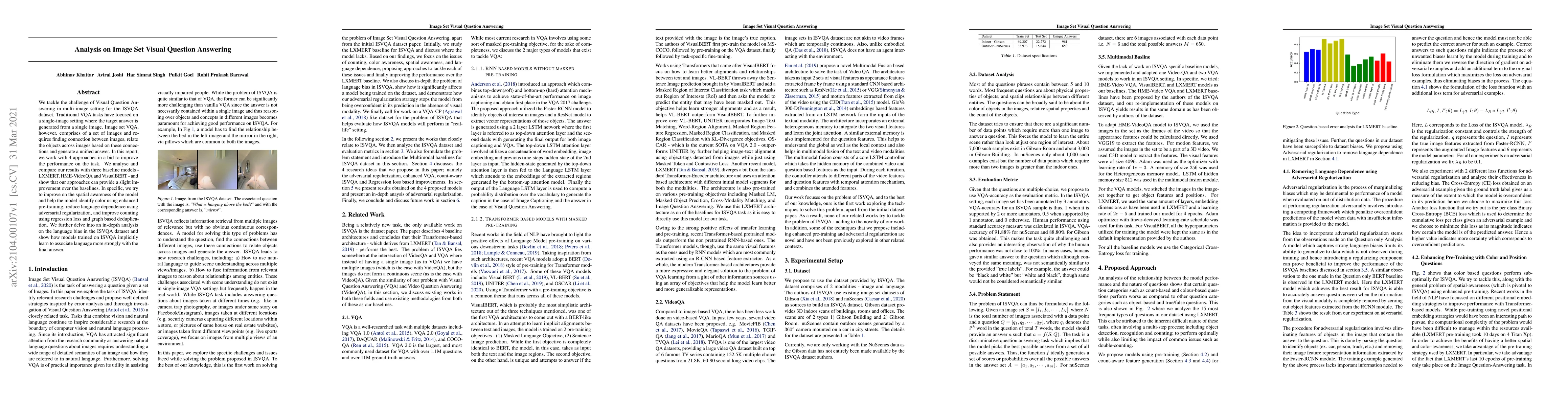 We tackle the challenge of Visual Question Answering in multi-image setting for the ISVQA dataset. Traditional VQA tasks have focused on a single-image setting where the target answer is generated from a single image. Image set VQA, however, comprises of a set of images and requires finding connection between images, relate the objects across images based on these connections and generate a unified answer. In this report, we work with 4 approaches in a bid to improve the performance on the task. We analyse and compare our results with three baseline models - LXMERT, HME-VideoQA and VisualBERT - and show that our approaches can provide a slight improvement over the baselines. In specific, we try to improve on the spatial awareness of the model and help the model identify color using enhanced pre-training, reduce language dependence using adversarial regularization, and improve counting using regression loss and graph based deduplication. We further delve into an in-depth analysis on the language bias in the ISVQA dataset and show how models trained on ISVQA implicitly learn to associate language more strongly with the final answer.