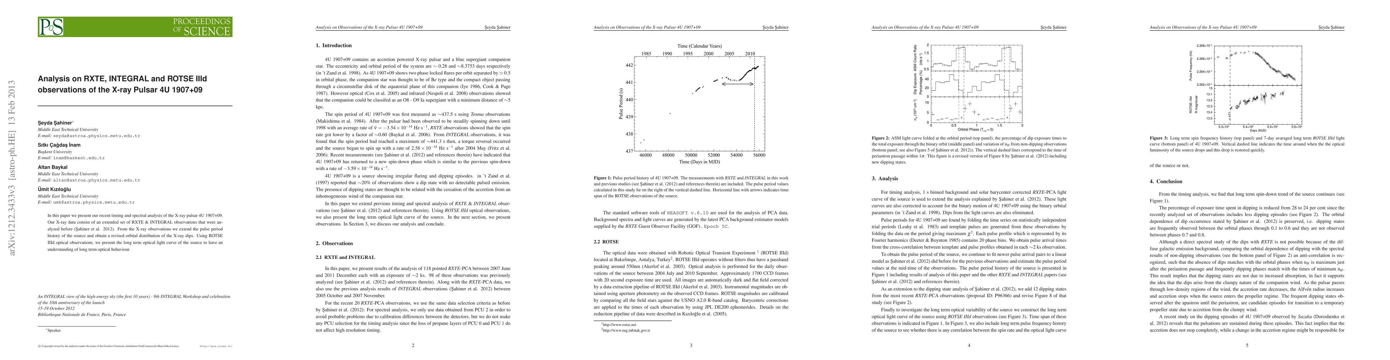 Researchers analyzed X-ray data from pulsar 4U 1907+09, revealing a revised pulse period history and orbital distribution of dips, as well as its long-term optical light curve.