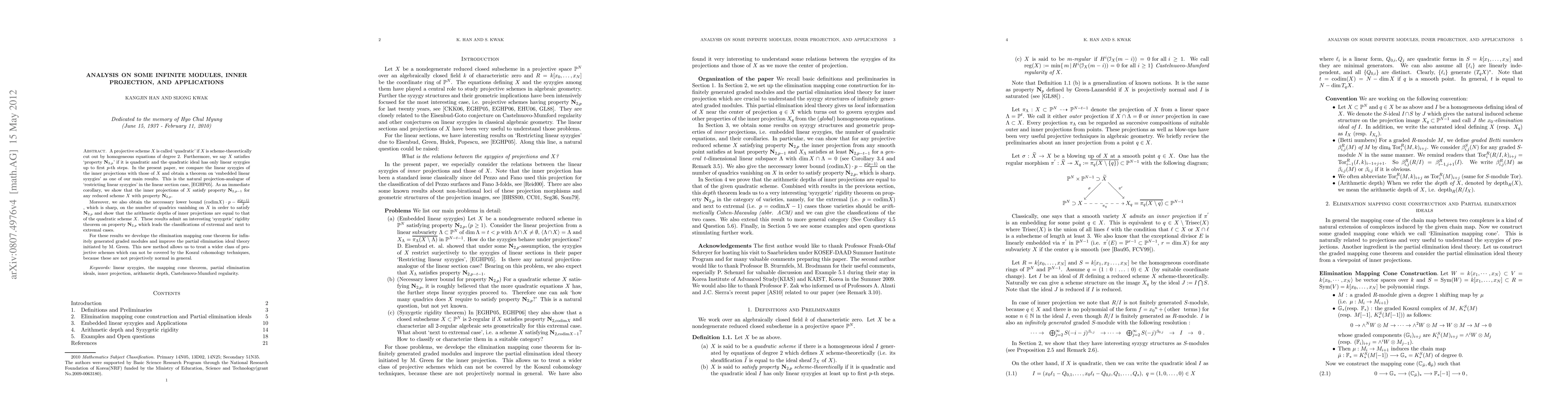 A projective scheme $X$ is called `quadratic' if $X$ is scheme-theoretically cut out by homogeneous equations of degree 2. Furthermore, we say $X$ satisfies `property $\textbf{N}_{2,p}$' if it is quadratic and the quadratic ideal has only linear syzygies up to first $p$-th steps. In the present paper, we compare the linear syzygies of the inner projections with those of $X$ and obtain a theorem on `embedded linear syzygies' as one of our main results. This is the natural projection-analogue of `restricting linear syzygies' in the linear section case, \cite{EGHP1}. As an immediate corollary, we show that the inner projections of $X$ satisfy property $\textbf{N}_{2,p-1}$ for any reduced scheme $X$ with property $\textbf{N}_{2,p}$. Moreover, we also obtain the neccessary lower bound $(\codim X)\cdot p -\frac{p(p-1)}{2}$, which is sharp, on the number of quadrics vanishing on $X$ in order to satisfy $\textbf{N}_{2,p}$ and show that the arithmetic depths of inner projections are equal to that of the quadratic scheme $X$. These results admit an interesting `syzygetic' rigidity theorem on property $\textbf{N}_{2,p}$ which leads the classifications of extremal and next to extremal cases. For these results we develope the elimination mapping cone theorem for infinitely generated graded modules and improve the partial elimination ideal theory initiated by M. Green. This new method allows us to treat a wider class of projective schemes which can not be covered by the Koszul cohomology techniques, because these are not projectively normal in general.