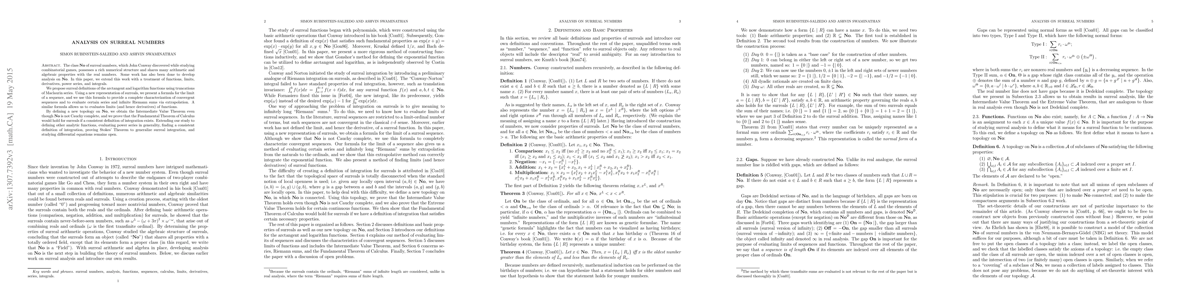 This paper extends the analysis of surreal numbers by introducing surreal definitions of arctangent and logarithm functions, and develops surreal limits, derivatives, and integrals. It also proposes a new surreal representation to characterize convergent sequences and evaluate series, and establishes a new topology to prove the Intermediate Value Theorem.