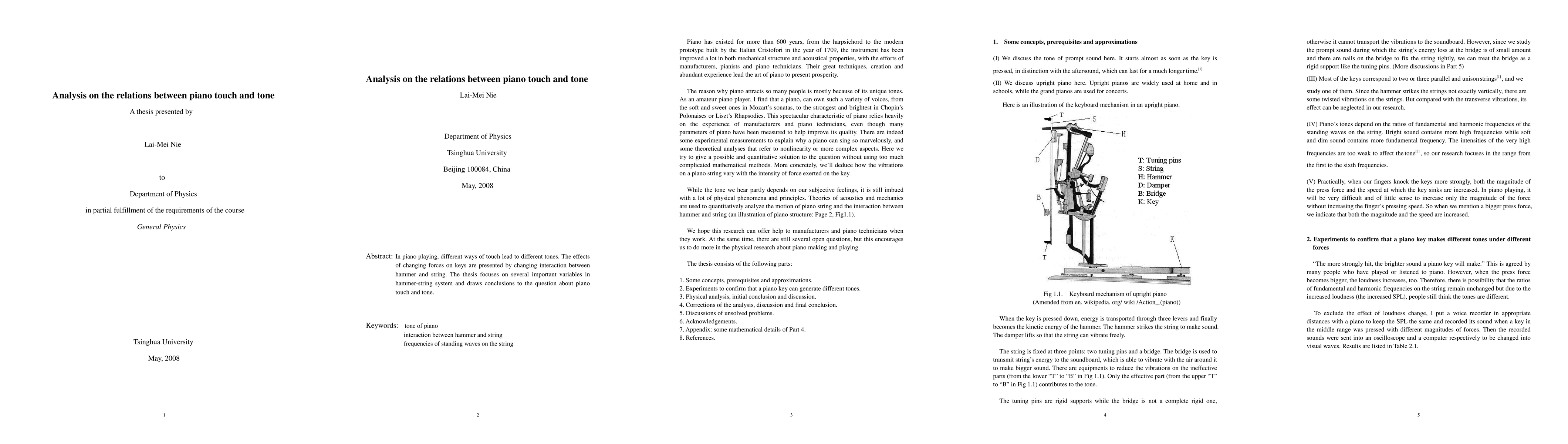 In piano playing, different ways of touch lead to different tones. The effects of changing forces on keys are presented by changing interaction between hammer and string. The thesis focuses on several important variables in hammer-string system and draws conclusions to the question about piano touch and tone.