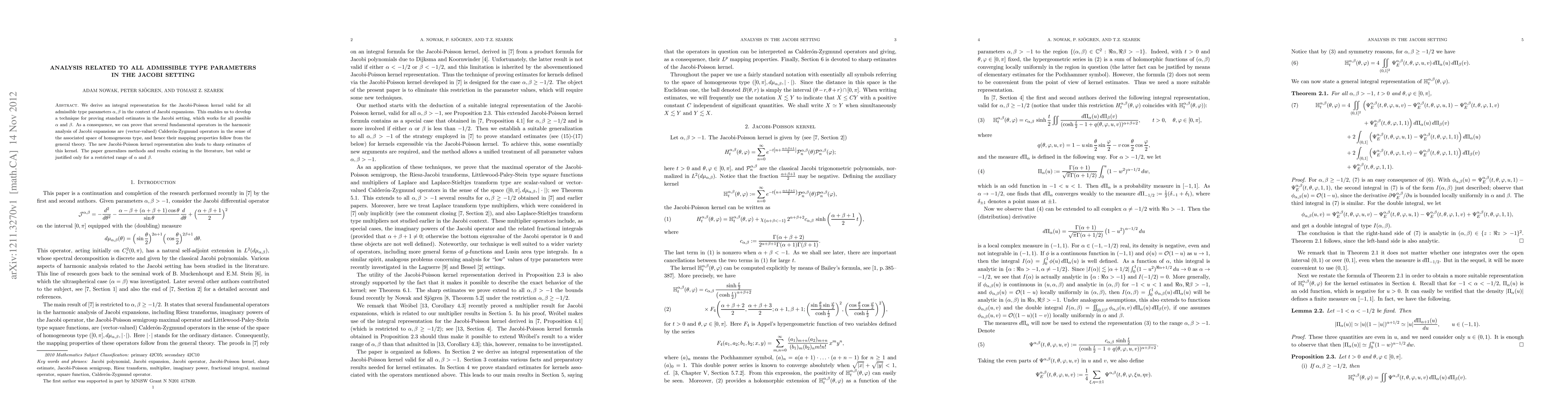 This paper derives an integral representation for the Jacobi-Poisson kernel for all admissible type parameters, enabling standard estimates in Jacobi expansions for any $\alpha$ and $\beta$. It establishes the mapping properties of fundamental operators as vector-valued Calderón-Zygmund operators.