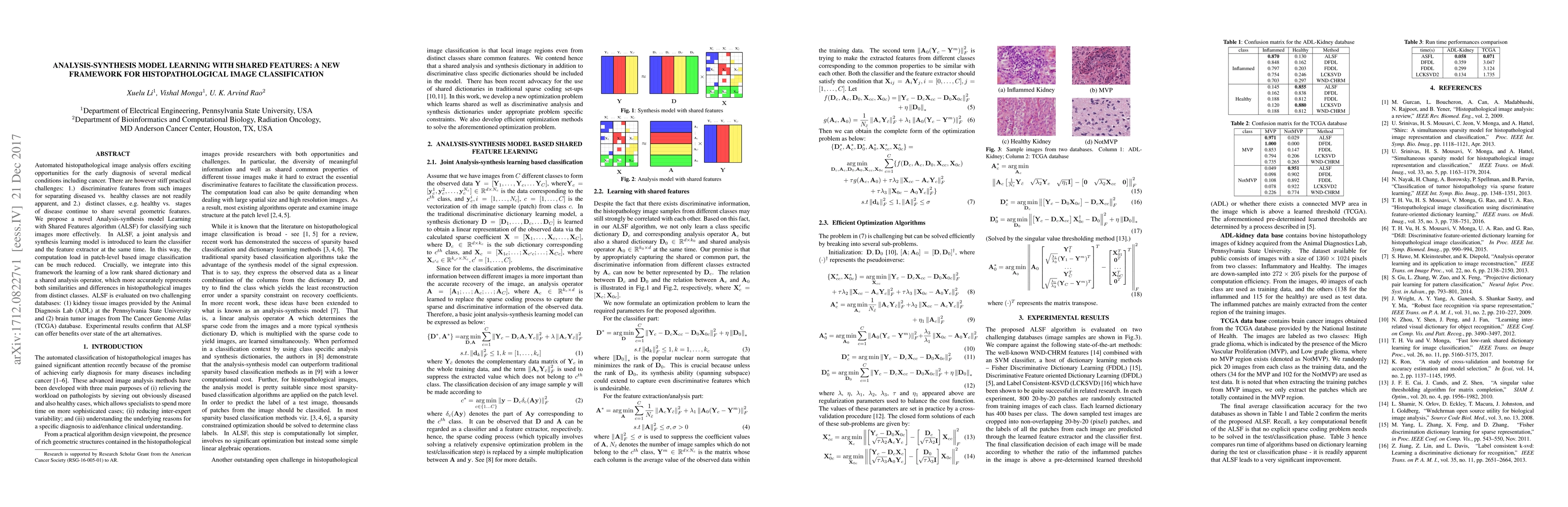 The paper proposes a novel Analysis-synthesis model Learning with Shared Features (ALSF) for histopathological image classification, addressing the challenges of non-apparent discriminative features and shared geometric features across classes. The ALSF framework integrates a joint analysis and synthesis model to reduce computational load and employs a low-rank shared dictionary and operator for better representation of image similarities and differences, outperforming state-of-the-art methods on kidney and brain tumor image datasets.
