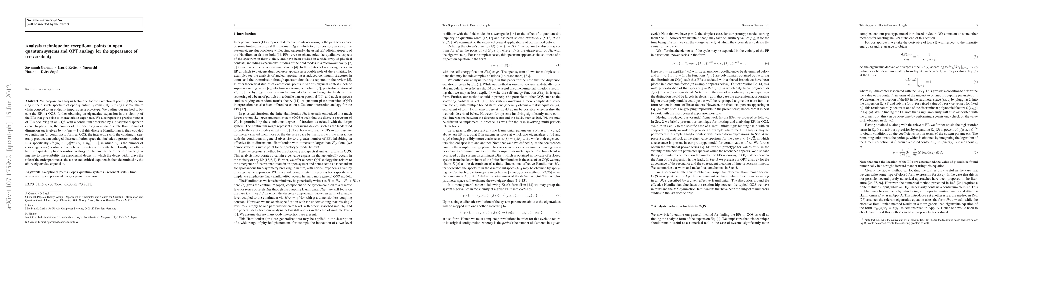 We propose an analysis technique for the exceptional points (EPs) occurring in the discrete spectrum of open quantum systems (OQS), using a semi-infinite chain coupled to an endpoint impurity as a prototype. We outline our method to locate the EPs in OQS, further obtaining an eigenvalue expansion in the vicinity of the EPs that gives rise to characteristic exponents. We also report the precise number of EPs occurring in an OQS with a continuum described by a quadratic dispersion curve. In particular, the number of EPs occurring in a bare discrete Hamiltonian of dimension $n_\textrm{D}$ is given by $n_\textrm{D} (n_\textrm{D} - 1)$; if this discrete Hamiltonian is then coupled to continuum (or continua) to form an OQS, the interaction with the continuum generally produces an enlarged discrete solution space that includes a greater number of EPs, specifically $2^{n_\textrm{C}} (n_\textrm{C} + n_\textrm{D}) [2^{n_\textrm{C}} (n_\textrm{C} + n_\textrm{D}) - 1] $, in which $n_\textrm{C}$ is the number of (non-degenerate) continua to which the discrete sector is attached. Finally, we offer a heuristic quantum phase transition analogy for the emergence of the resonance (giving rise to irreversibility via exponential decay) in which the decay width plays the role of the order parameter; the associated critical exponent is then determined by the above eigenvalue expansion.