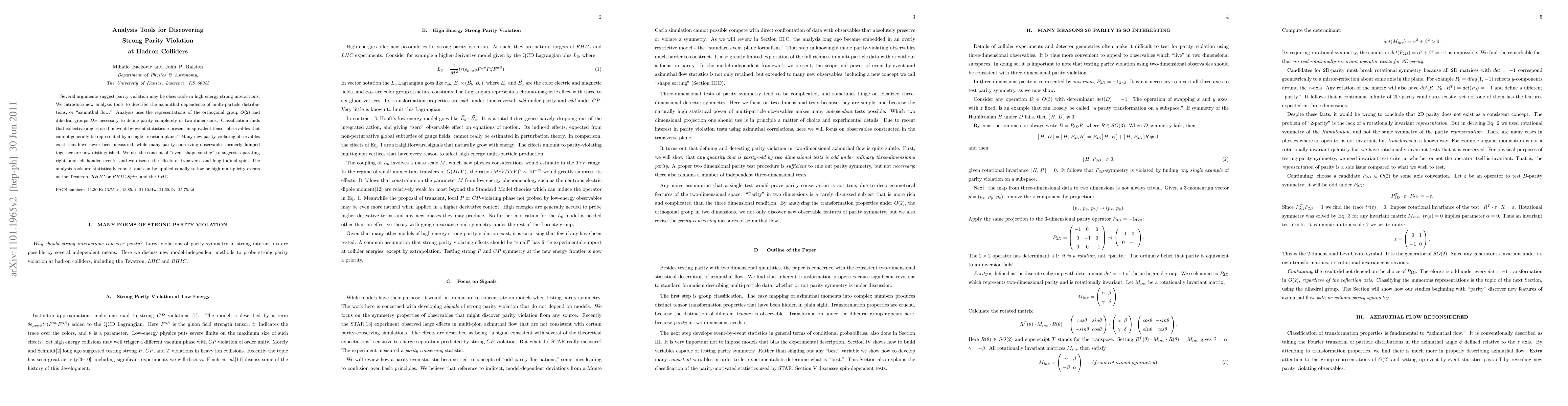 Several arguments suggest parity violation may be observable in high energy strong interactions. We introduce new analysis tools for describing the azimuthal dependence of multi-particle distributions, or "azimuthal flow." Analysis uses the representations of the orthogonal group O(2) and dihedral groups $D_{N}$ necessary to define parity correctly in two dimensions. Classification finds that collective angles used in event-by-event statistics represent inequivalent tensor observables that cannot generally be represented by a single "reaction plane". Many new parity-violating observables exist that have never been measured, while many new parity-conserving observables formerly lumped together are now distinguished. We use the concept of "event shape sorting" to suggest separating right- and left-handed events, and we discuss the effects of transverse and longitudinal spin. The analysis tools are statistically robust, and can be applied equally to low or high multiplicity events at the Tevatron, $RHIC$ or $RHIC\, Spin$, and the $LHC$.