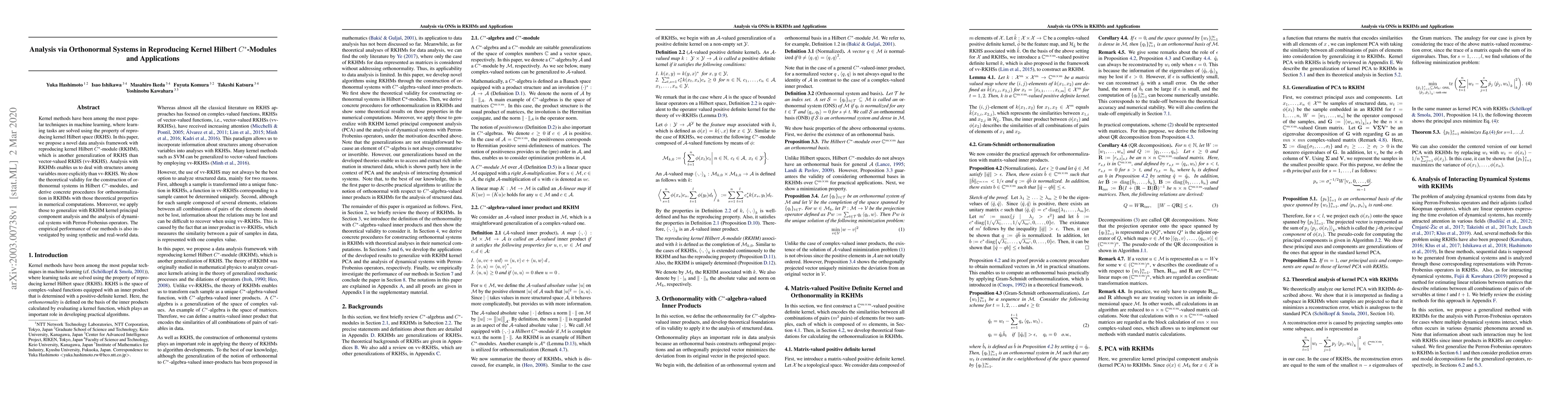Kernel methods have been among the most popular techniques in machine learning, where learning tasks are solved using the property of reproducing kernel Hilbert space (RKHS). In this paper, we propose a novel data analysis framework with reproducing kernel Hilbert $C^*$-module (RKHM), which is another generalization of RKHS than vector-valued RKHS (vv-RKHS). Analysis with RKHMs enables us to deal with structures among variables more explicitly than vv-RKHS. We show the theoretical validity for the construction of orthonormal systems in Hilbert $C^*$-modules, and derive concrete procedures for orthonormalization in RKHMs with those theoretical properties in numerical computations. Moreover, we apply those to generalize with RKHM kernel principal component analysis and the analysis of dynamical systems with Perron-Frobenius operators. The empirical performance of our methods is also investigated by using synthetic and real-world data.