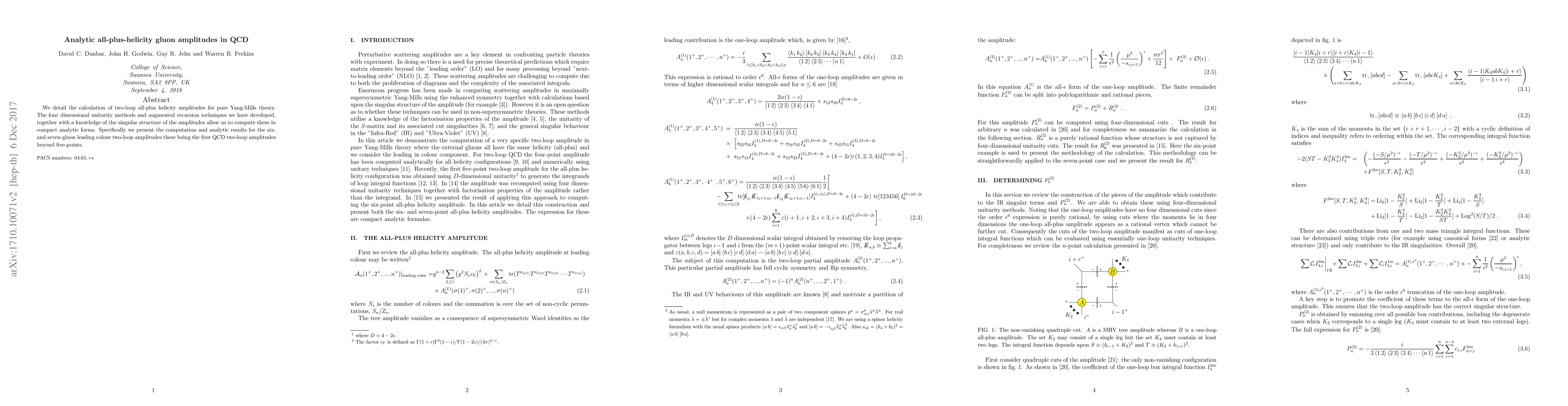 This paper presents the computation of two-loop all-plus helicity gluon amplitudes in pure Yang-Mills theory using advanced four-dimensional unitarity methods and recursion techniques. The authors provide the first analytic results for six- and seven-gluon leading color amplitudes beyond five-points.