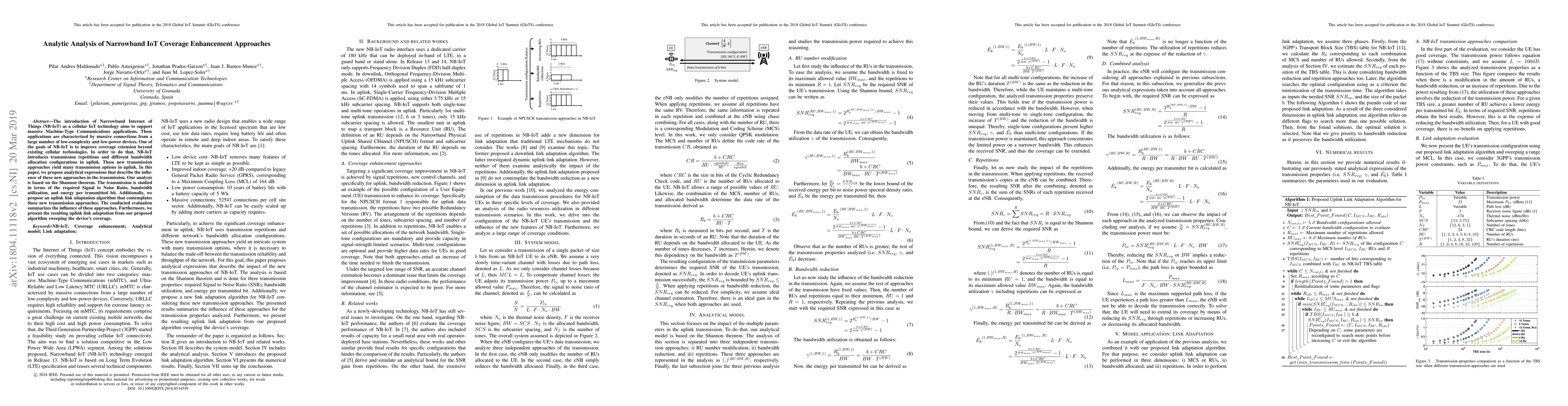 This paper proposes analytical expressions to evaluate the coverage enhancement of Narrowband IoT (NB-IoT) using new uplink transmission approaches, including repetitions and bandwidth allocations. It also introduces an uplink link adaptation algorithm based on the Shannon theorem, assessing its impact on signal quality, bandwidth use, and energy efficiency.
