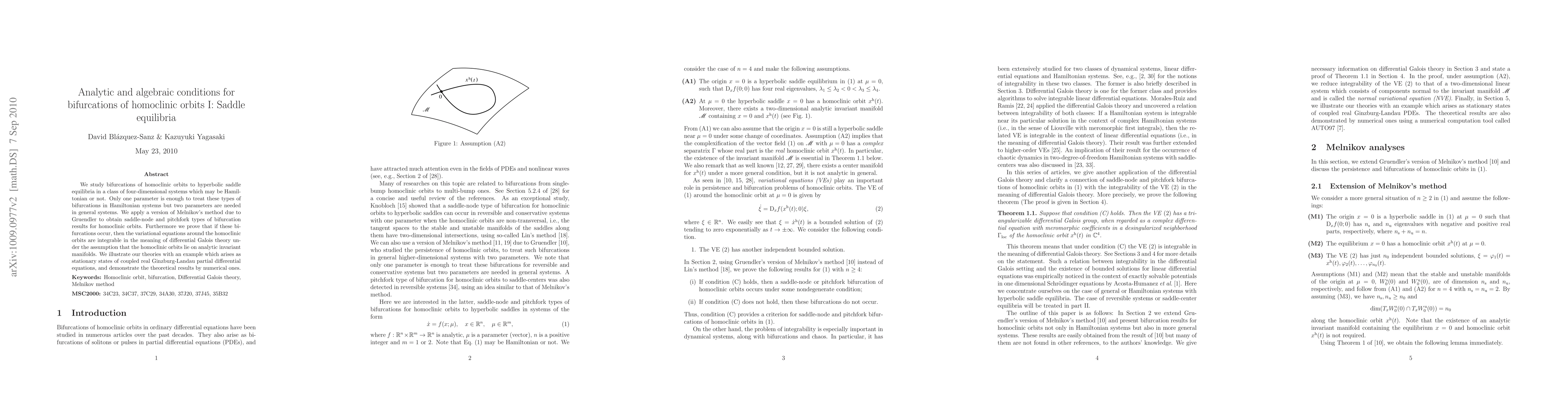 This paper investigates bifurcations of homoclinic orbits near saddle equilibria in four-dimensional systems, employing a modified Melnikov's method to identify saddle-node and pitchfork bifurcations. It proves integrability conditions for variational equations under differential Galois theory, validated with examples from coupled real Ginzburg-Landau equations and numerical simulations.