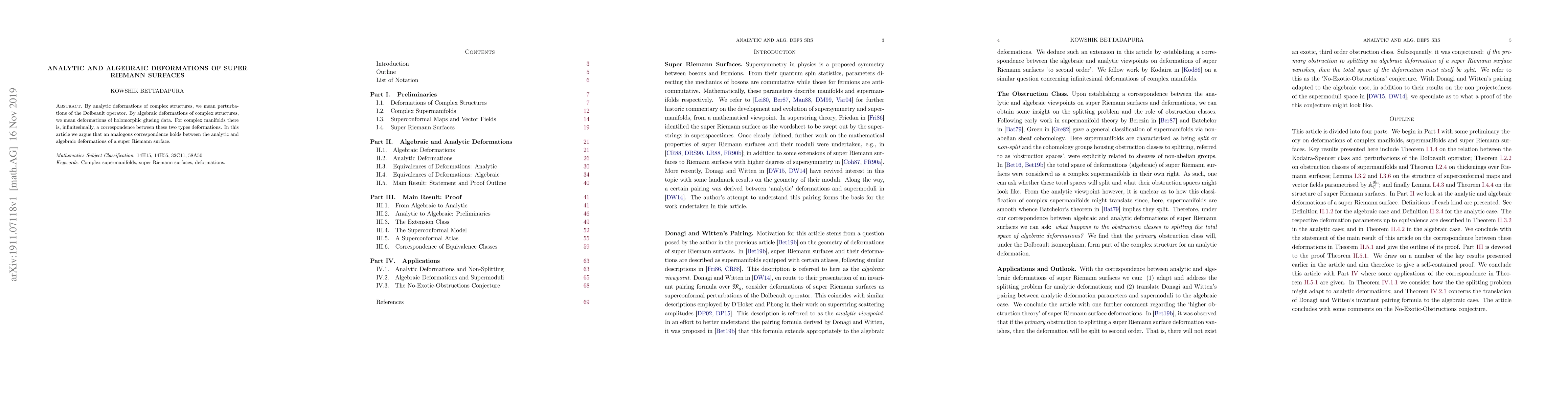 This paper explores the correspondence between analytic deformations, which involve perturbations of the Dolbeault operator, and algebraic deformations, which involve deformations of holomorphic glueing data, in the context of super Riemann surfaces. The authors argue that an analogous relationship exists between these two types of deformations as seen in complex manifolds.