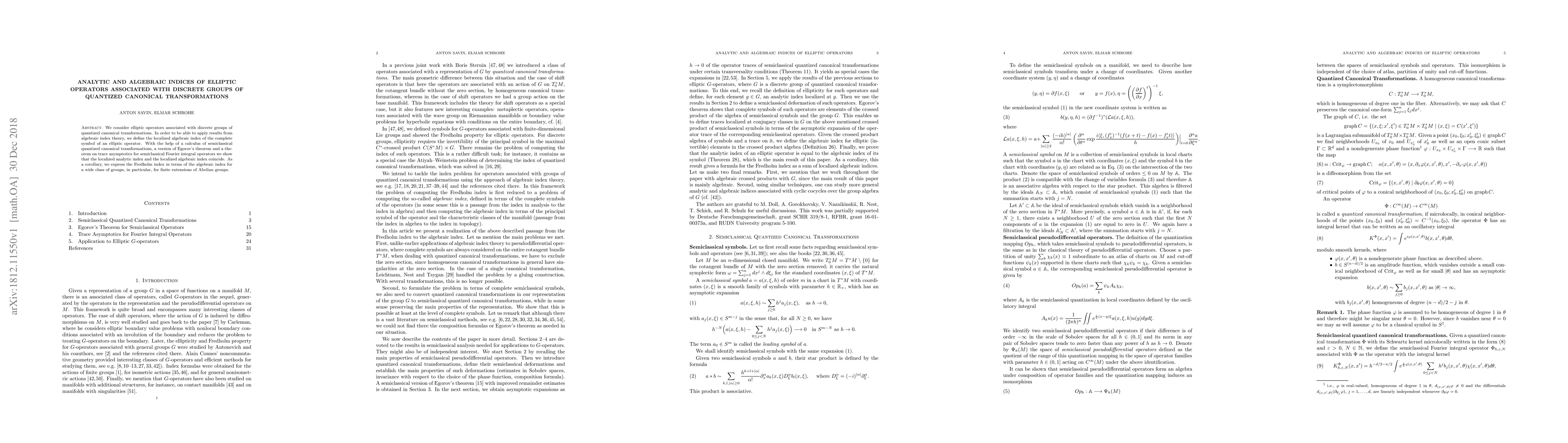This paper investigates elliptic operators linked to discrete groups of quantized canonical transformations, establishing a connection between their localized analytic and algebraic indices. It demonstrates that these indices coincide, thereby expressing the Fredholm index in terms of the algebraic index for a broad class of groups, including finite extensions of Abelian groups.