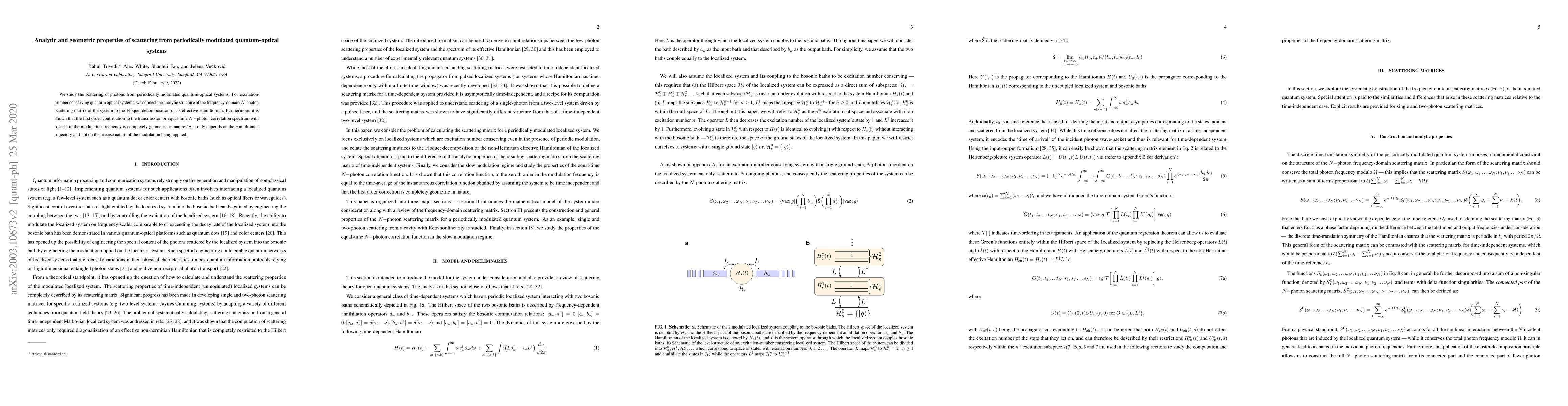 We study the scattering of photons from periodically modulated quantum-optical systems. For excitation-number conserving quantum optical systems, we connect the analytic structure of the frequency-domain N-photon scattering matrix of the system to the Floquet decomposition of its effective Hamiltonian. Furthermore, it is shown that the first order contribution to the transmission or equal-time N-photon correlation spectrum with respect to the modulation frequency is completely geometric in nature i.e. it only depends on the Hamiltonian trajectory and not on the precise nature of the modulation being applied.