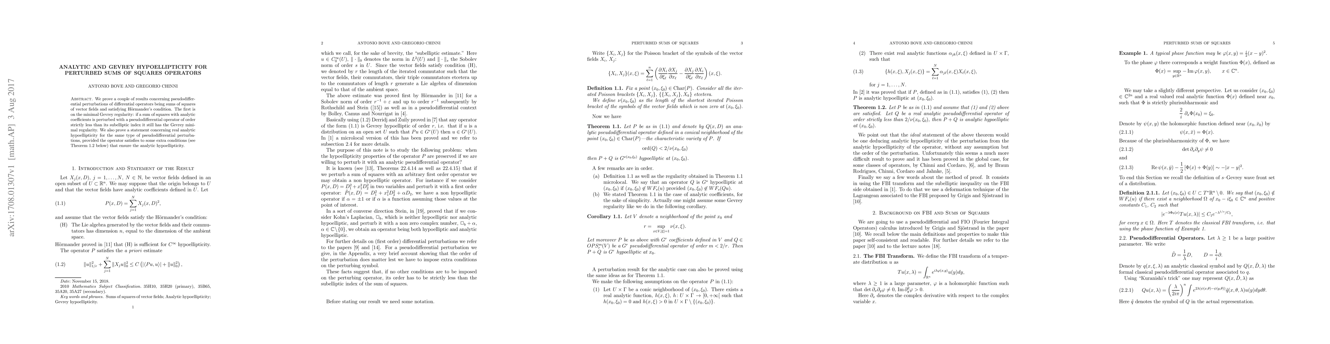 This paper proves that pseudodifferential perturbations of sums of squares of vector fields, which satisfy Hörmander's condition, retain Gevrey minimal regularity if the perturbation order is strictly less than the subelliptic index. Additionally, it establishes real analytic hypoellipticity under certain extra conditions.