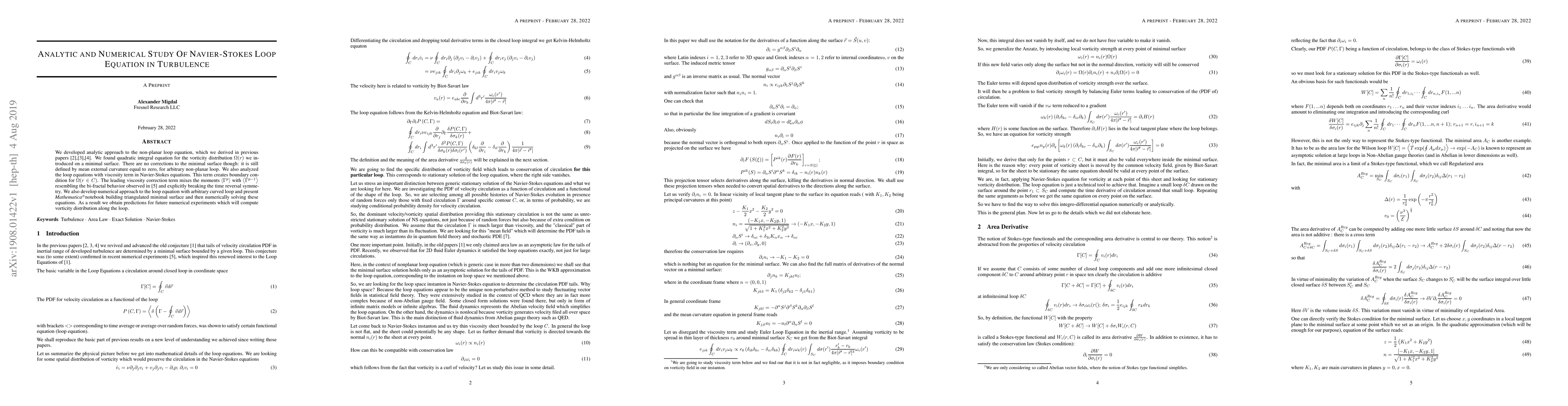 We developed analytic approach to the non-planar loop equation, which we derived in previous papers \cite{M19a},\cite{M19b},\cite{M19c}. We found quadratic integral equation for the vorticity distribution $\Omega(r)$ we introduced on a minimal surface. There are no corrections to the minimal surface though: it is still defined by mean external curvature equal to zero, for arbitrary non-planar loop. We also analyzed the loop equations with viscosity term in Navier-Stokes equations. This term creates boundary condition for $\Omega(r\in C)$. The leading viscosity correction term mixes the moments $\left< \Gamma^p \right>$ with $\left< \Gamma^{p-1} \right>$ resembling the bi-fractal behavior observed in \cite{S19} and explicitly breaking the time reversal symmetry. We also develop numerical approach to the loop equation with arbitrary curved loop and present \Mathematica notebook building triangulated minimal surface and then numerically solving these equations. As a result we obtain predictions for future numerical experiments which will compute vorticity distribution along the loop.