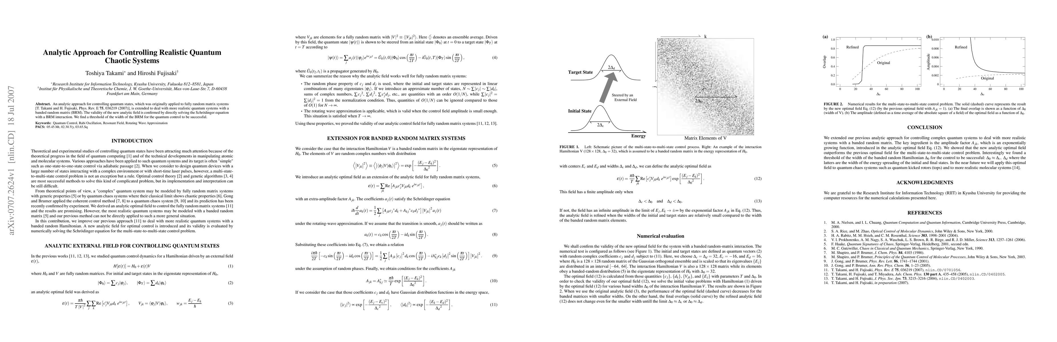 An analytic approach for controlling quantum states, which was originally applied to fully random matrix systems [T. Takami and H. Fujisaki, Phys. Rev. E 75, 036219 (2007)], is extended to deal with more realistic quantum systems with a banded random matrix (BRM). The validity of the new analytic field is confirmed by directly solving the Schroedinger equation with a BRM interaction. We find a threshold of the width of the BRM for the quantum control to be successful.