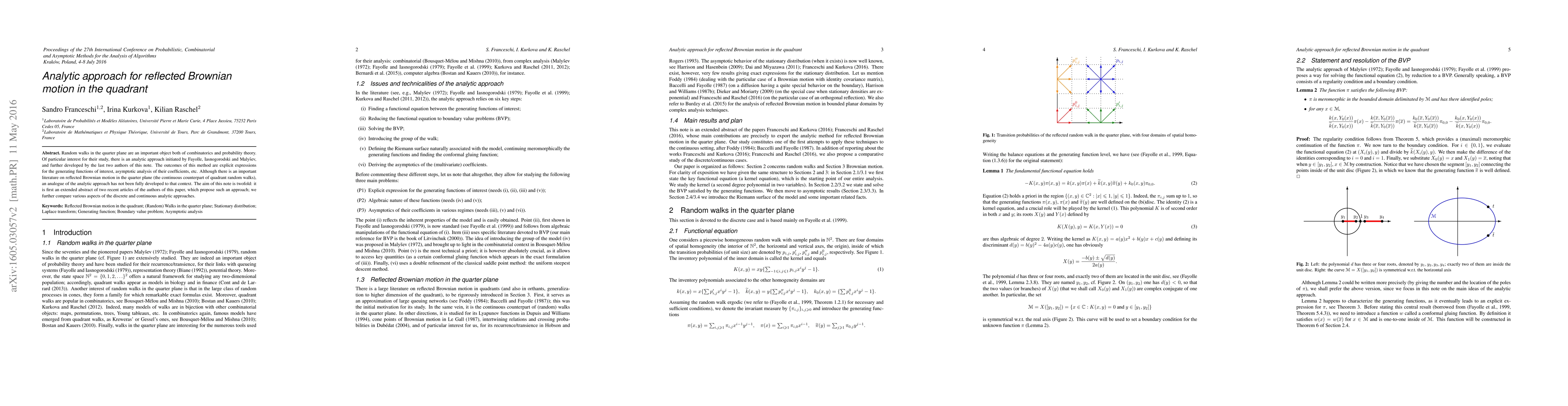 The paper develops an analytic approach for reflected Brownian motion in the quadrant, extending previous work on random walks in the quarter plane. It uses Cauchy integrals, residue theorem, and saddle-point analysis to derive explicit expressions and asymptotic behaviors.