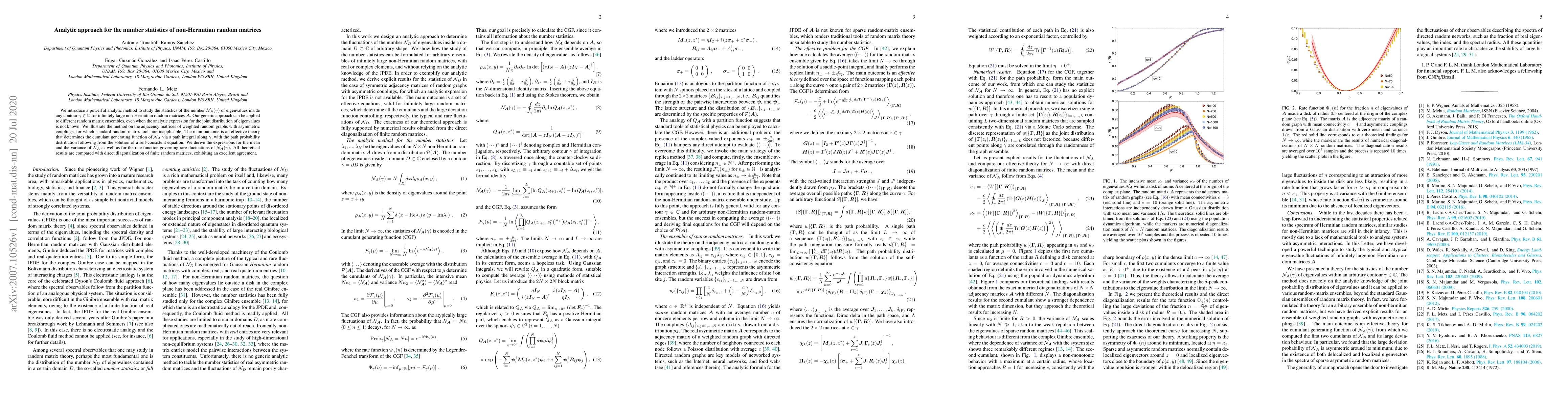 This paper introduces an analytic method for studying eigenvalue statistics in large non-Hermitian random matrices, applicable even when the joint distribution is unknown. The method yields an effective theory determining the cumulant generating function via a path integral, and is validated against direct diagonalization of finite matrices.