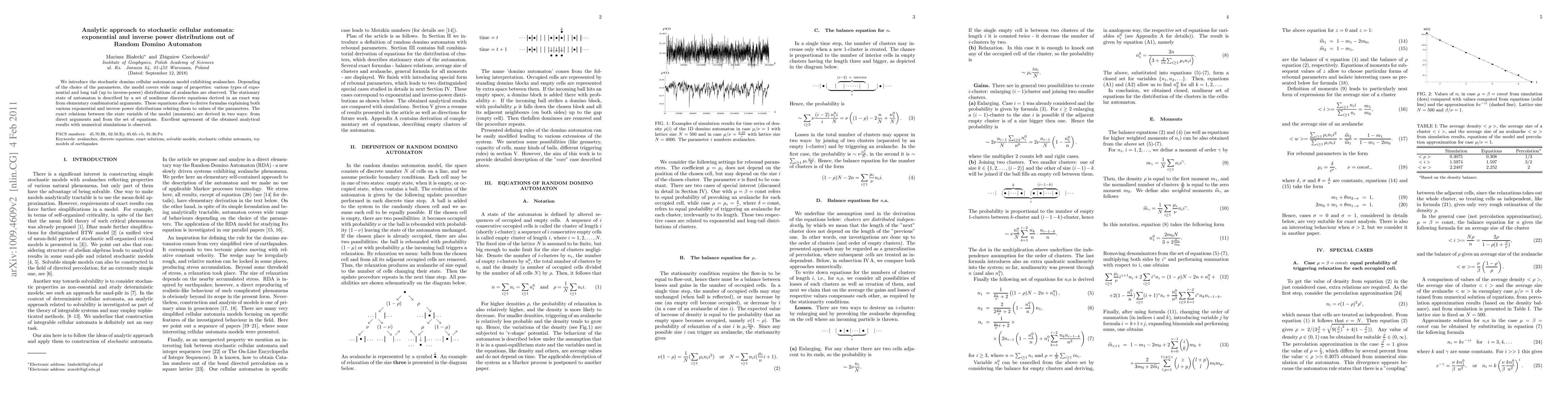 Inspired by extremely simplified view of the earthquakes we propose the stochastic domino cellular automaton model exhibiting avalanches. From elementary combinatorial arguments we derive a set of nonlinear equations describing the automaton. Exact relations between the average parameters of the model are presented. Depending on imposed triggering, the model reproduces both exponential and inverse power statistics of clusters.