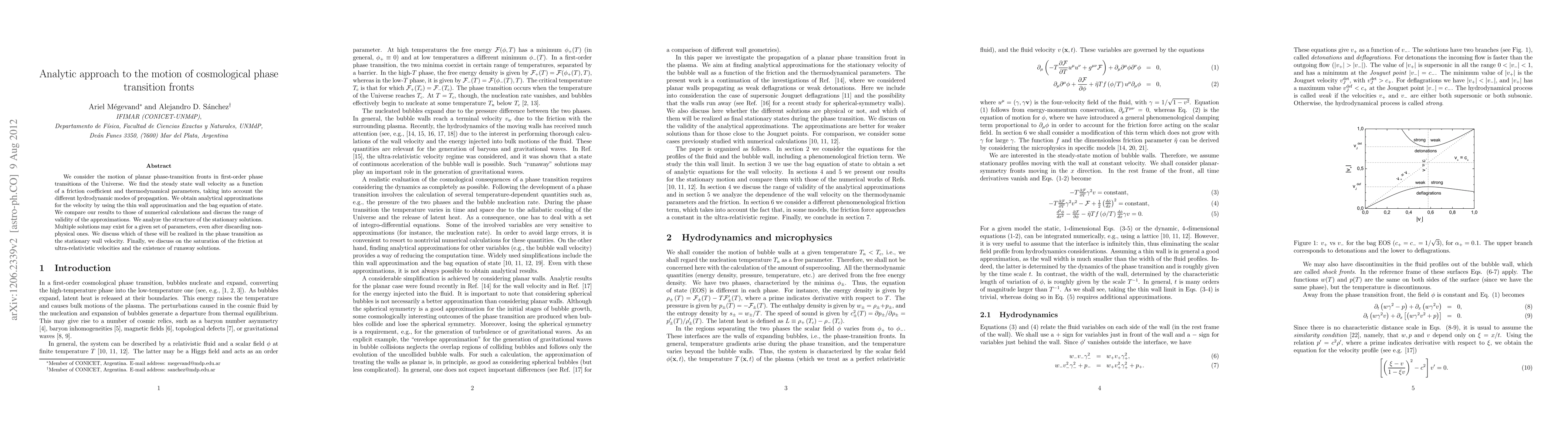 This paper analytically investigates the steady-state velocity of planar phase-transition fronts in cosmological first-order phase transitions, deriving approximations using the thin wall approximation and bag equation of state. It discusses the range of validity of these approximations and the existence of multiple physical solutions for the wall velocity.