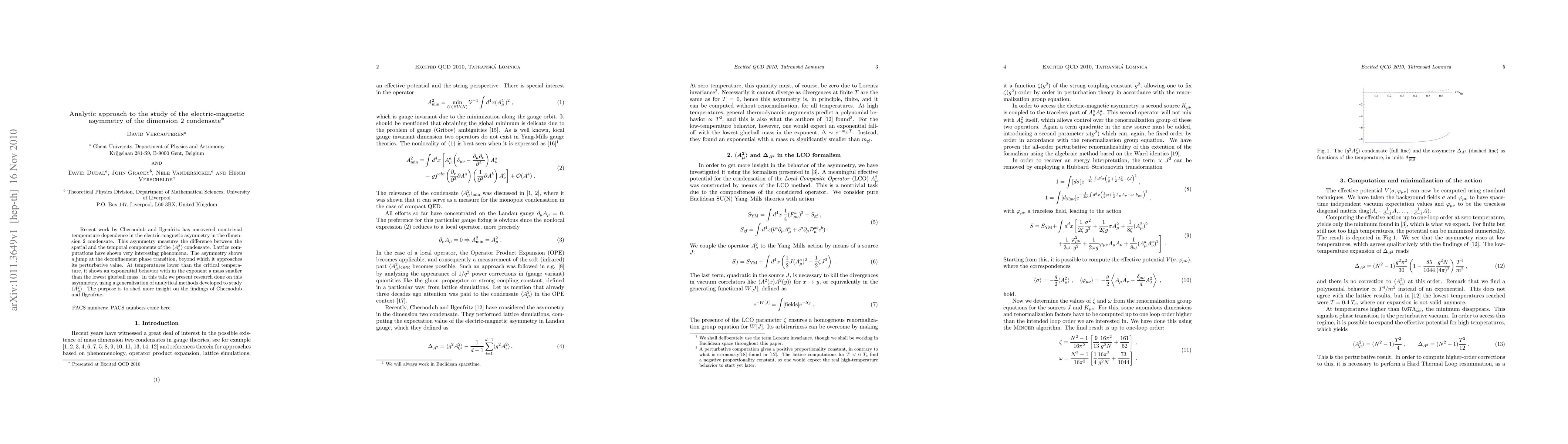Recent work by Chernodub and Ilgenfritz has uncovered non-trivial temperature dependence in the electric-magnetic asymmetry in the dimension 2 condensate. This asymmetry measures the difference between the spatial and the temporal components of the condensate. Lattice computations have shown very interesting phenomena. The asymmetry shows a jump at the deconfinement phase transition, beyond which it approaches its perturbative value. At temperatures lower than the critical temperature, it shows an exponential behavior with in the exponent a mass smaller than the lowest glueball mass. In this talk we present research done on this asymmetry, using a generalization of analytical methods developed to study . The purpose is to shed more insight on the findings of Chernodub and Ilgenfritz.