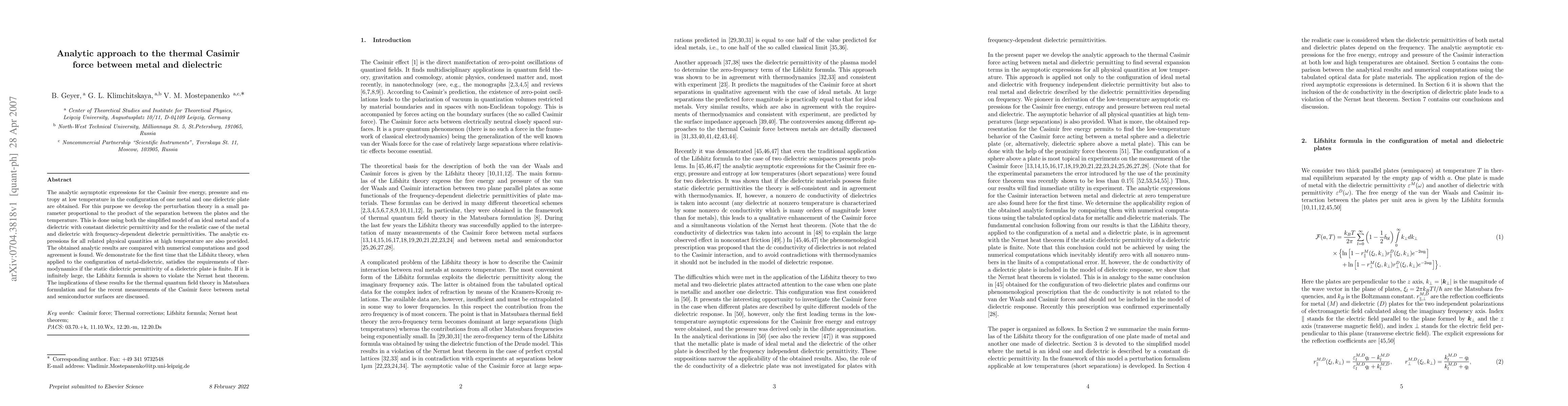 Researchers develop an analytic approach to calculate the thermal Casimir force between metal and dielectric plates, finding that it satisfies thermodynamics under certain conditions and has implications for quantum field theory and recent measurements of the Casimir force.