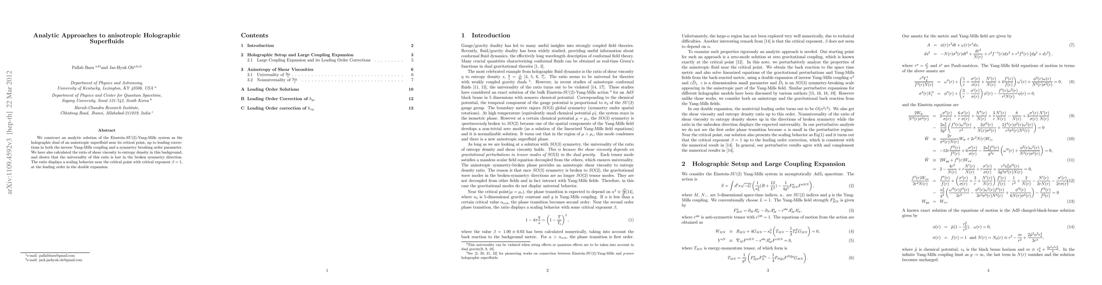 This paper presents an analytic solution for the Einstein-SU(2)-Yang-Mills system representing anisotropic holographic superfluids near their critical point, revealing a loss of universality in the shear viscosity to entropy density ratio in the broken symmetry direction. The ratio exhibits a critical exponent $\beta=1$ near the critical point.